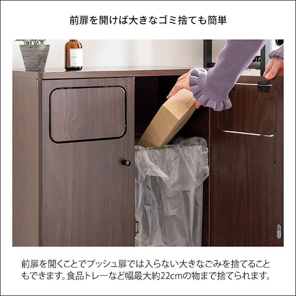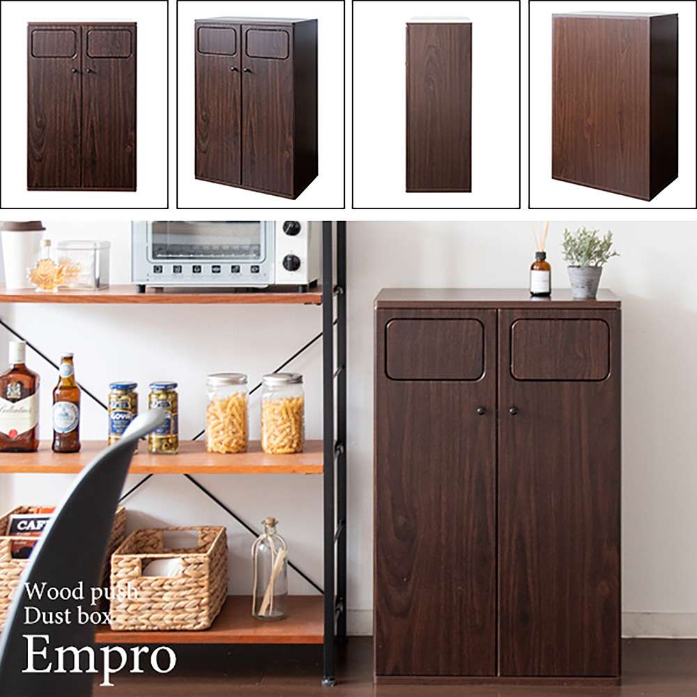 ゴミ箱に見えないスタイリッシュなデザインでお部屋に馴染む、木製プッシュ式ダストボックス『Empro(エンプロー)』の二連タイプ。 キッチンなどでのゴミの分別が楽に行えます。 ニオイが漏れにくく押すだけで簡単に捨てられるプッシュ扉式。それぞれ容量45Lでたっぷり入るので大家族のご家庭でも快適。 ゴミ袋の着脱も簡単な前扉があり、利便性もバツグンです。