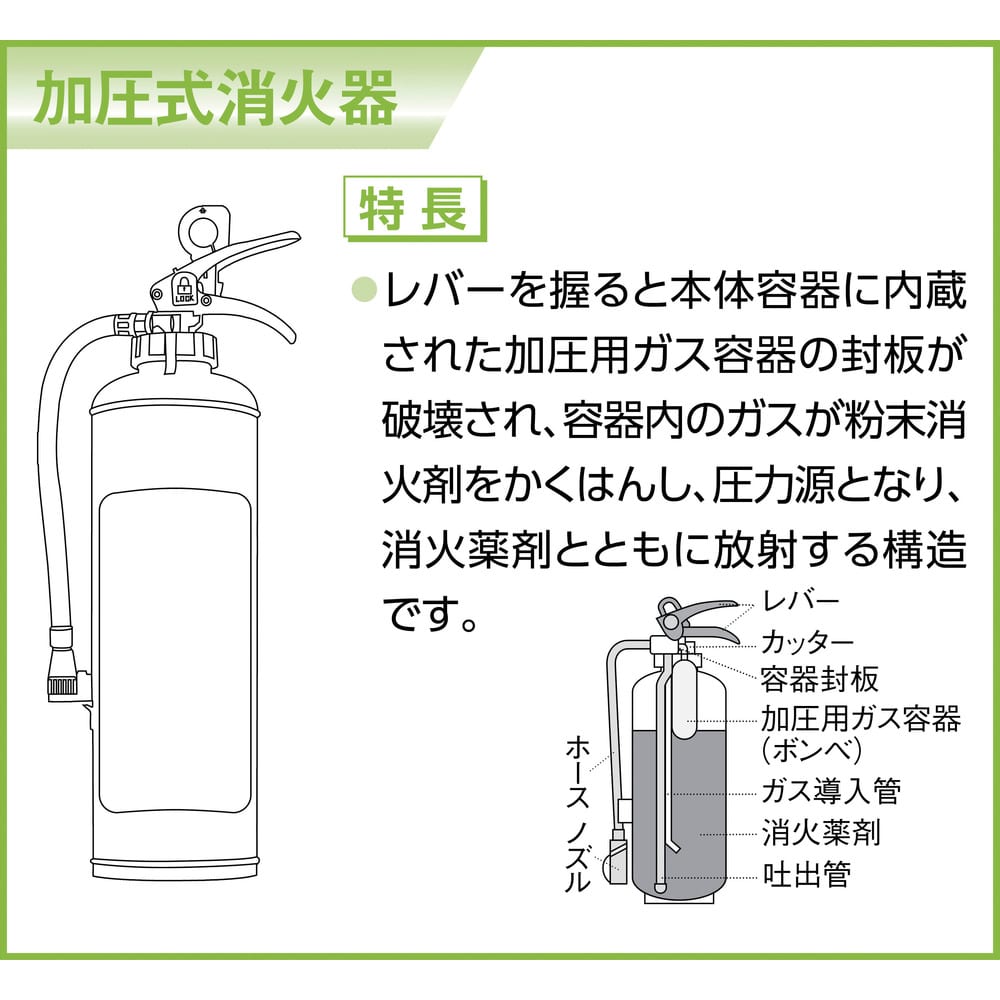 ●環境に優しいエコ消火器です。●放射時間(秒):約15●放射距離(m):3~6●薬剤量(kg):3●高さ(mm):472●設計標準使用期限:10年●18500.0●ガス加圧式 質量4.9kg