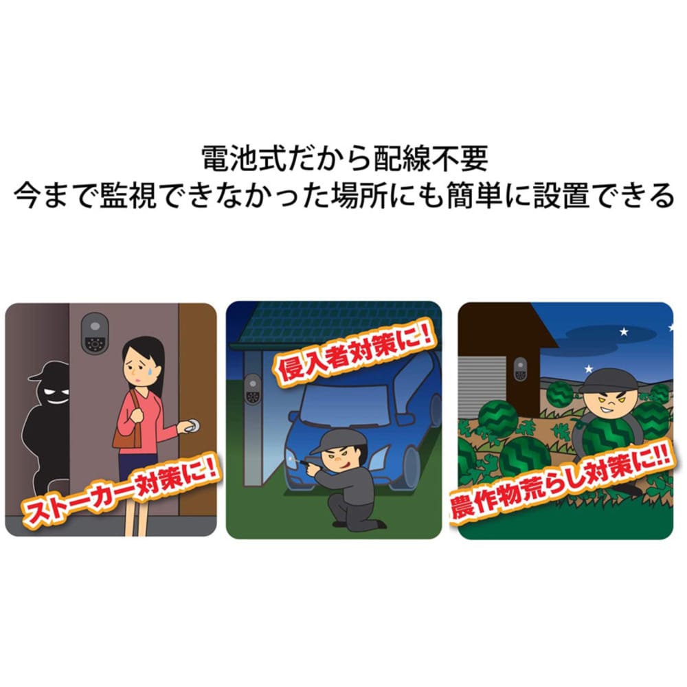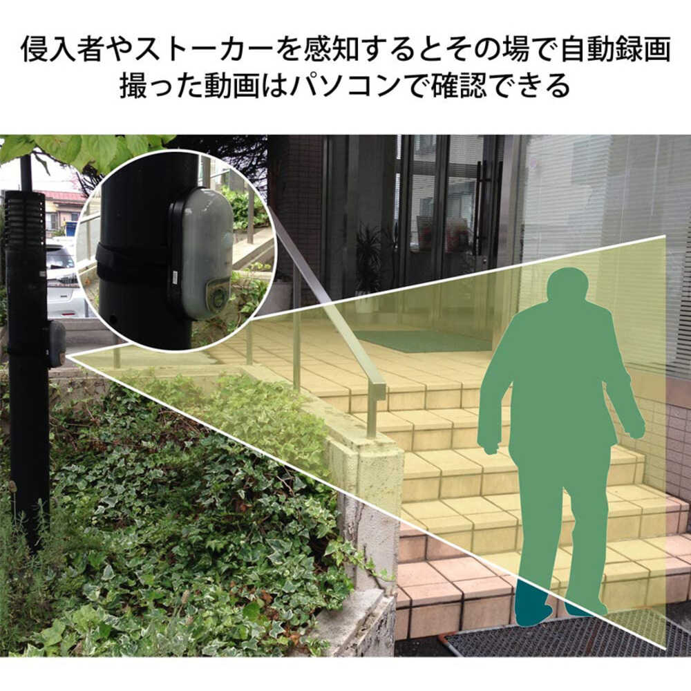 ●侵入者やストーカーを感知するとその場でmicroSDカードに自動録画します。●電池式だからどこにでも設置できます。●夜間でも赤外線LEDで録画します。●LEDセンサーライト機能付き 動画モード・静止画モードを選べます。●撮った画像はパソコンで確認できます。●幅(mm):62●奥行(mm):54●高さ(mm):139●最大画素数(万):30●電源:単3形アルカリ乾電池×3本(別売) 専用ACアダプターX0505 / X0505B(別売)●画質:VGA●給電方式:専用ACアダプターX0505 / X0505B(別売使用可)●視野角(°):水平100° / 垂直60° ※高さ1.5m設置時●光源色:白●接続端子:USB mini Type-B●サイズ:W6.2×H13.9×D5.4cm●生産国:中国●電源:単3形アルカリ電池3本(別売)、又は、ACアダプター X0505、X0505B(別売)●電池寿命:センサーライトOFF時 動画を1日10回録画して約3カ月。●※センサーライトがONの時は短くなります。 質量143g