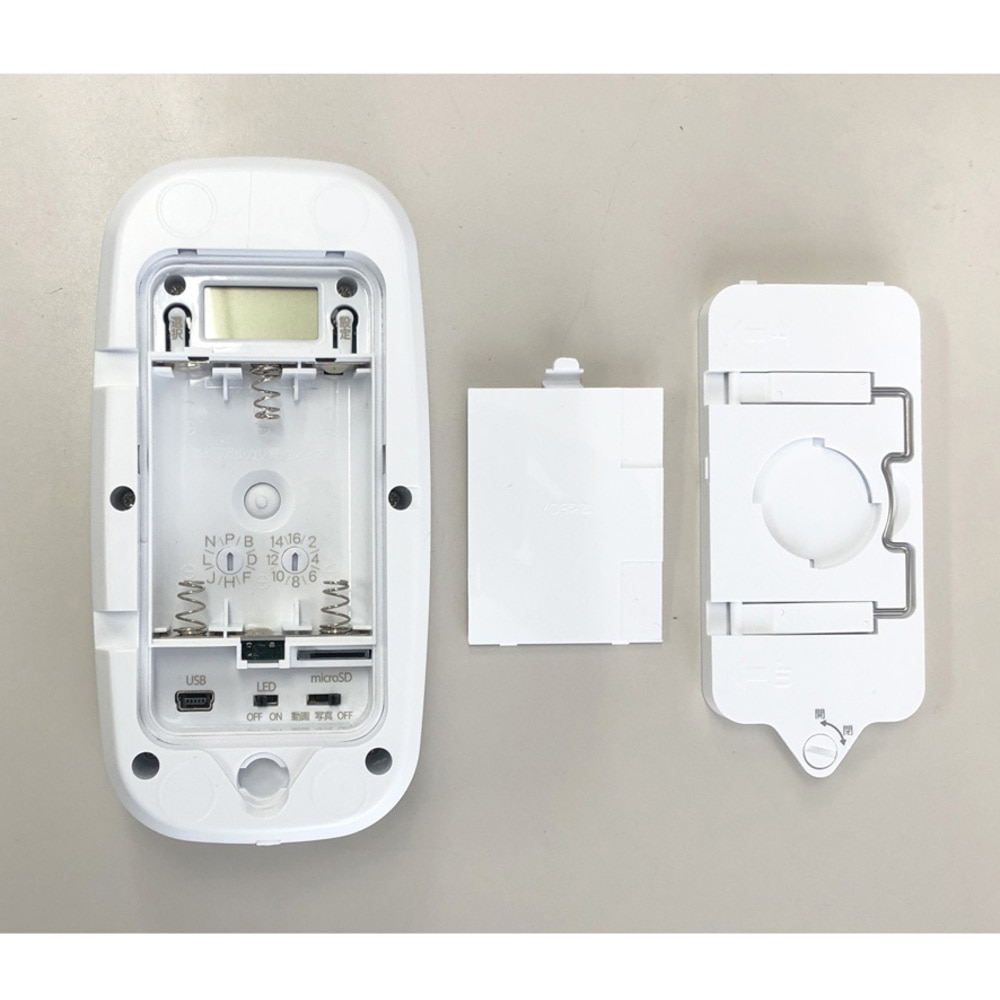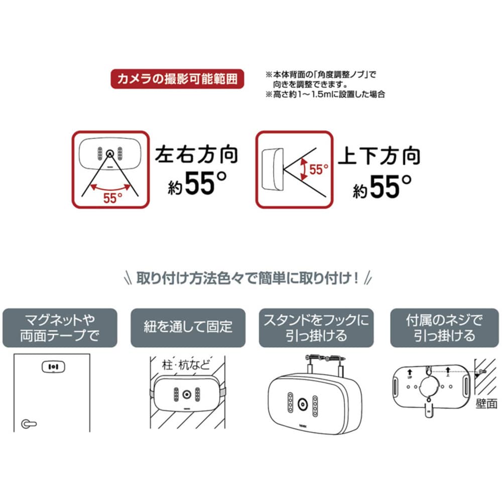 ●人感センサーが反応すると、少し離れた場所でカメラが自動で撮影してmicroSDカードにデータを保存します。●撮影したデータはパソコンで確認できます。●配線不要なので簡単に取り付けできます。●センサーは防雨仕様・カメラは屋外軒下設置可能です。●送信機の電池切れが受信機でもわかる、電池切れお知らせ機能があります。●256通りのIDコードで混信しません。●最大画素数(万):30●視野角(°):水平 約55°/垂直 約55°(角度調整可能)※高さ1.5m設置時●解像度:VGA●接続端子:USB mini Type-B●送信器幅×奥行×高さ(mm):77×35×83●受信器幅×奥行×高さ(mm):142×37×74●電源:送信機 単4形アルカリ乾電池3本(別売)、または専用ACアダプターX0505・X0505B(別売)●電源:受信機 単3形アルカリ乾電池3本(別売)、または専用ACアダプターX0505・X0505B(別売)●設置場所:送信機(屋外・屋内)/受信機(屋内・屋外軒下)●電池寿命:カメラ 動画=15秒を1日10回録画して約3ヶ月/写真=3枚を1日10回撮影して約6ヶ月 質量232g