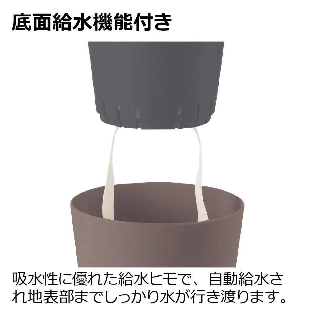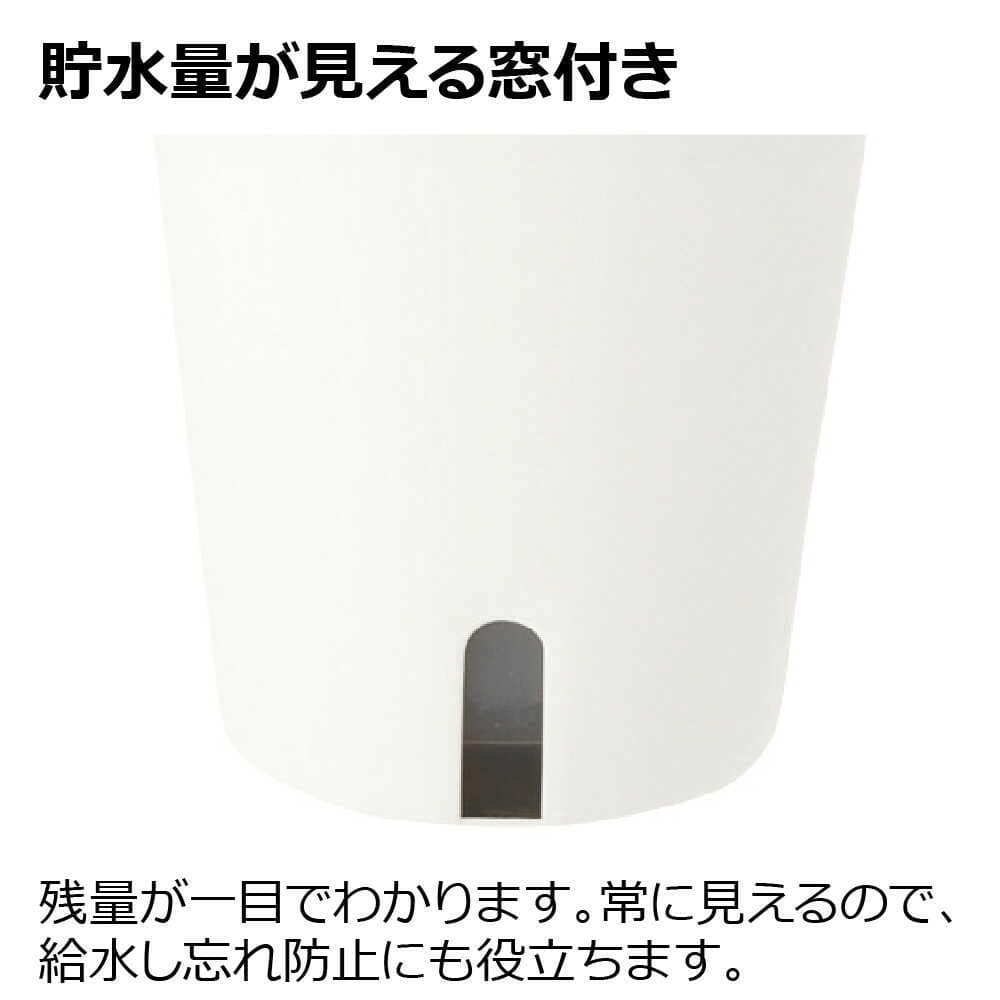 ポンと植えて、たま~に水やり、給水口から水やりができる底面給水鉢です。 おおよそ1/3~1/4の回数ですむので水やりがラクです。 ※植物の種類や気温など、生育条件によって異なります。 吸水性に優れた給水ヒモで、自動給水され地表部までしっかり水が行き渡る、底面給水機能付きです。 貯水量が見える窓付きで、残量が一目でわかります。常に見えるので、給水し忘れ防止にも役立ちます。 上容器を置いたまま給水できます。水さしなどで給水口から水を注げます。 給水口からの水やりで、貯水部を清潔に保つことができます。 段付きスリット排水穴で、通気性と排水性を高めます。 ポットのサイズに合わせてあるので、植え替えが簡単にできます。