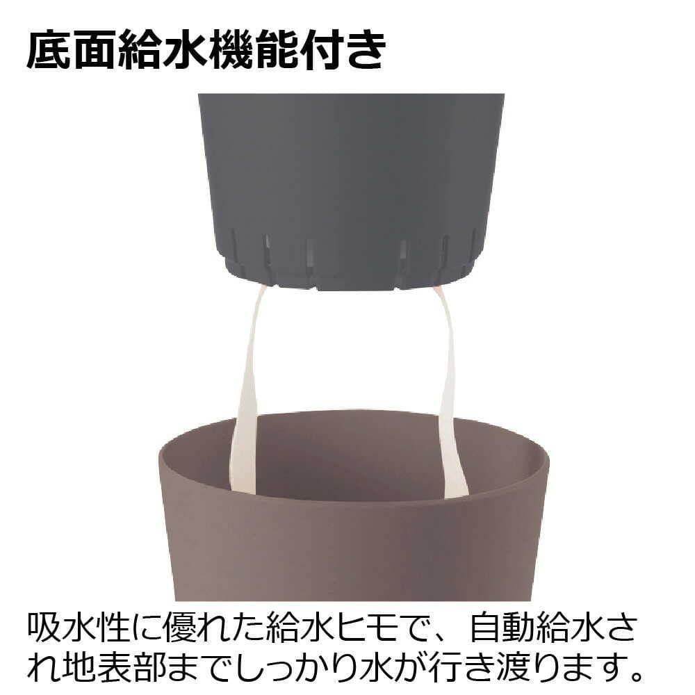 ポンと植えて、たま~に水やり、給水口から水やりができる底面給水鉢です。 おおよそ1/3~1/4の回数ですむので水やりがラクです。 ※植物の種類や気温など、生育条件によって異なります。 吸水性に優れた給水ヒモで、自動給水され地表部までしっかり水が行き渡る、底面給水機能付きです。 貯水量が見える窓付きで、残量が一目でわかります。常に見えるので、給水し忘れ防止にも役立ちます。 上容器を置いたまま給水できます。水さしなどで給水口から水を注げます。 給水口からの水やりで、貯水部を清潔に保つことができます。 段付きスリット排水穴で、通気性と排水性を高めます。 ポットのサイズに合わせてあるので、植え替えが簡単にできます。