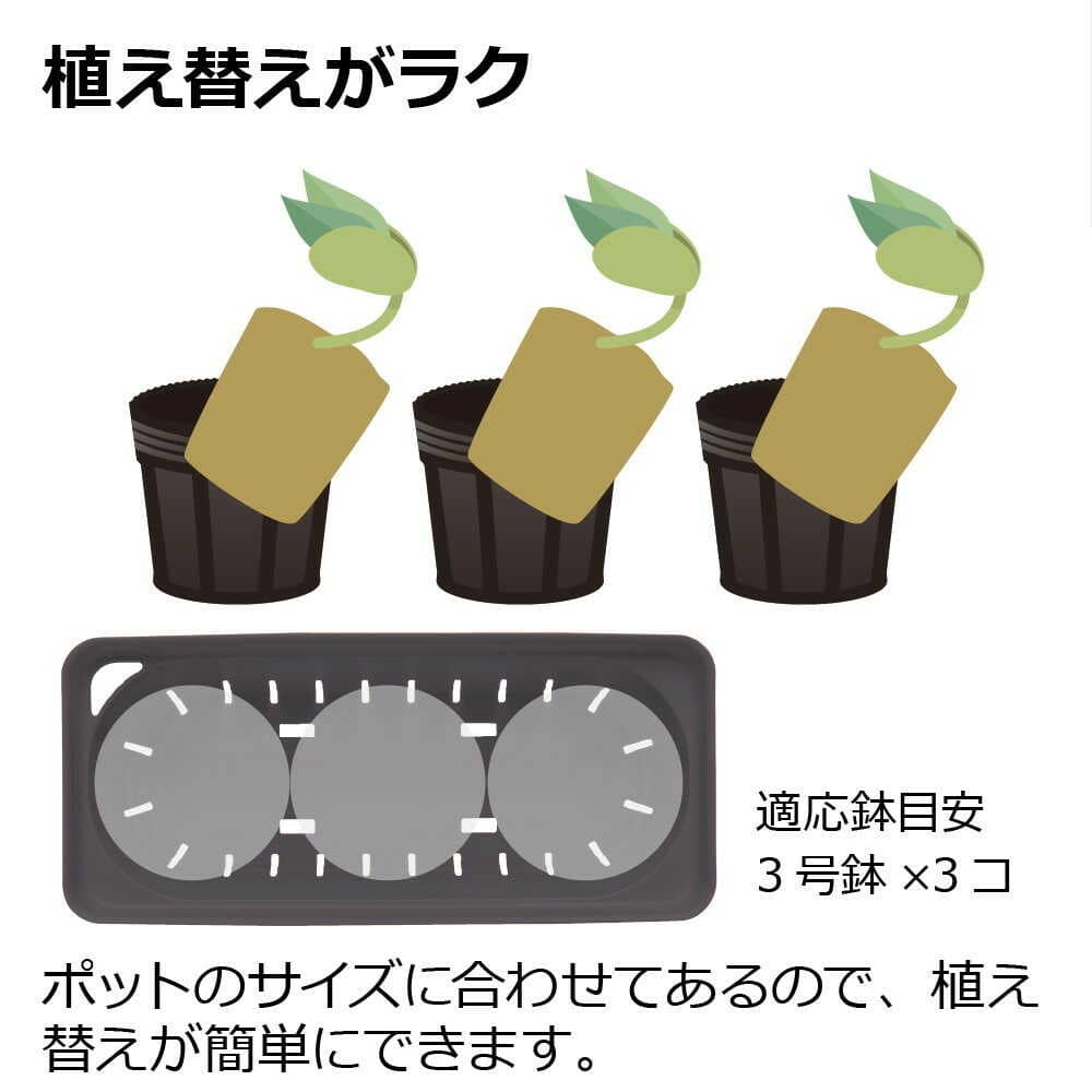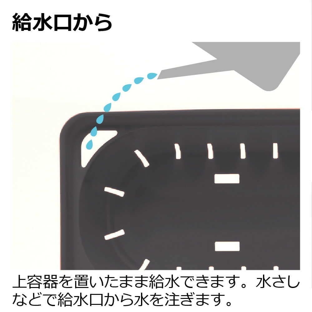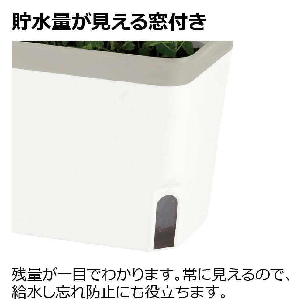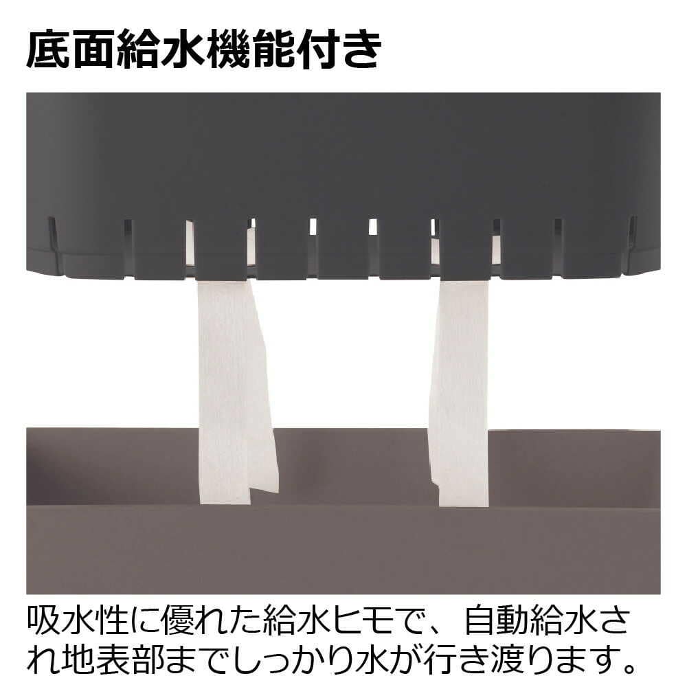 ポンと植えて、たま~に水やり、給水口から水やりができる底面給水鉢です。 おおよそ1/3~1/4の回数ですむので水やりがラクです。 ※植物の種類や気温など、生育条件によって異なります。 吸水性に優れた給水ヒモで、自動給水され地表部までしっかり水が行き渡る、底面給水機能付きです。 貯水量が見える窓付きで、残量が一目でわかります。常に見えるので、給水し忘れ防止にも役立ちます。 上容器を置いたまま給水できます。水さしなどで給水口から水を注げます。 給水口からの水やりで、貯水部を清潔に保つことができます。 段付きスリット排水穴で、通気性と排水性を高めます。 ポットのサイズに合わせてあるので、植え替えが簡単にできます。