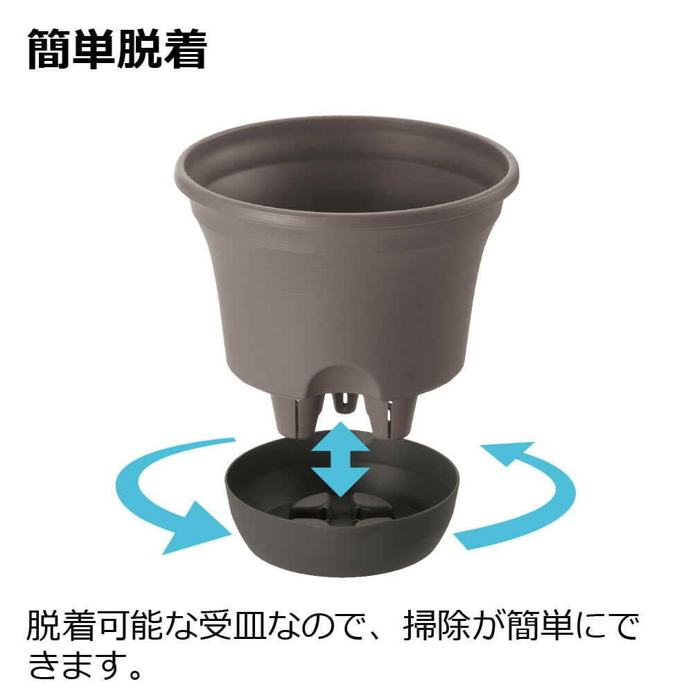 受皿に貯水するタイプの底面給水コンテナ。 受皿に貯まった水が自然に吸い上げられるので、水やり回数が少なくてすみます。 受皿に貯水できるので、上容器を置いたまま、吸水口から水さしなどで水を注いで貯水できます。 貯水部より水を補給する底面給水機能付きで、水やりの手間を軽減できます。 簡単に脱着できる受皿なので、掃除が簡単にできます。
