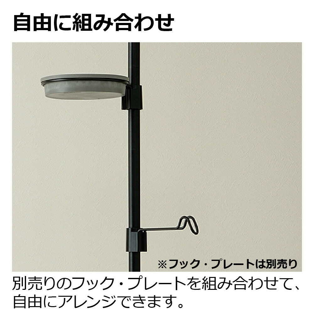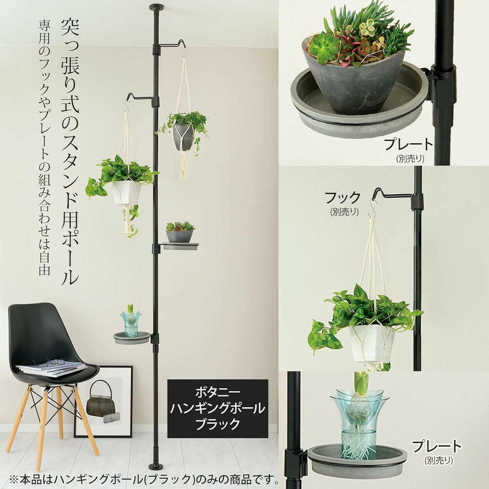 省スペースで空間をボタニカルに演出。 つっぱり式のハンギングポールです。 別売りのフック・プレートの組み合わせで、自由にカスタマイズできます。 上下つっぱり式なので、取付け簡単で、壁などに穴を開ける必要がありません。 床部分は、ポールの接地部分しか使わないので、省スペース設置でき、お掃除がしやすいです。 別売りのフック・プレートを組み合わせて、自由にアレンジできます。 植物がポールにかからない長さで、S字フックが掛けやすい先端形状です。 上下、360度方向に動かしやすいので、日当たり調節の際、位置変更ができます。 プレートは、水がこぼれないように、しっかり深さがある形状です。 ワイヤーから外して、プレートの移動ができます。 フックは、上下、360度方向に動かしやすいので、日当たり調節の際、位置変更ができます。 台座は、共通なのでワイヤー部の抜き差しで、簡単に入れ替えできます。