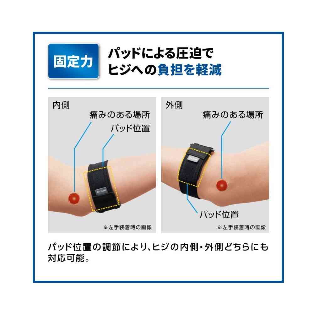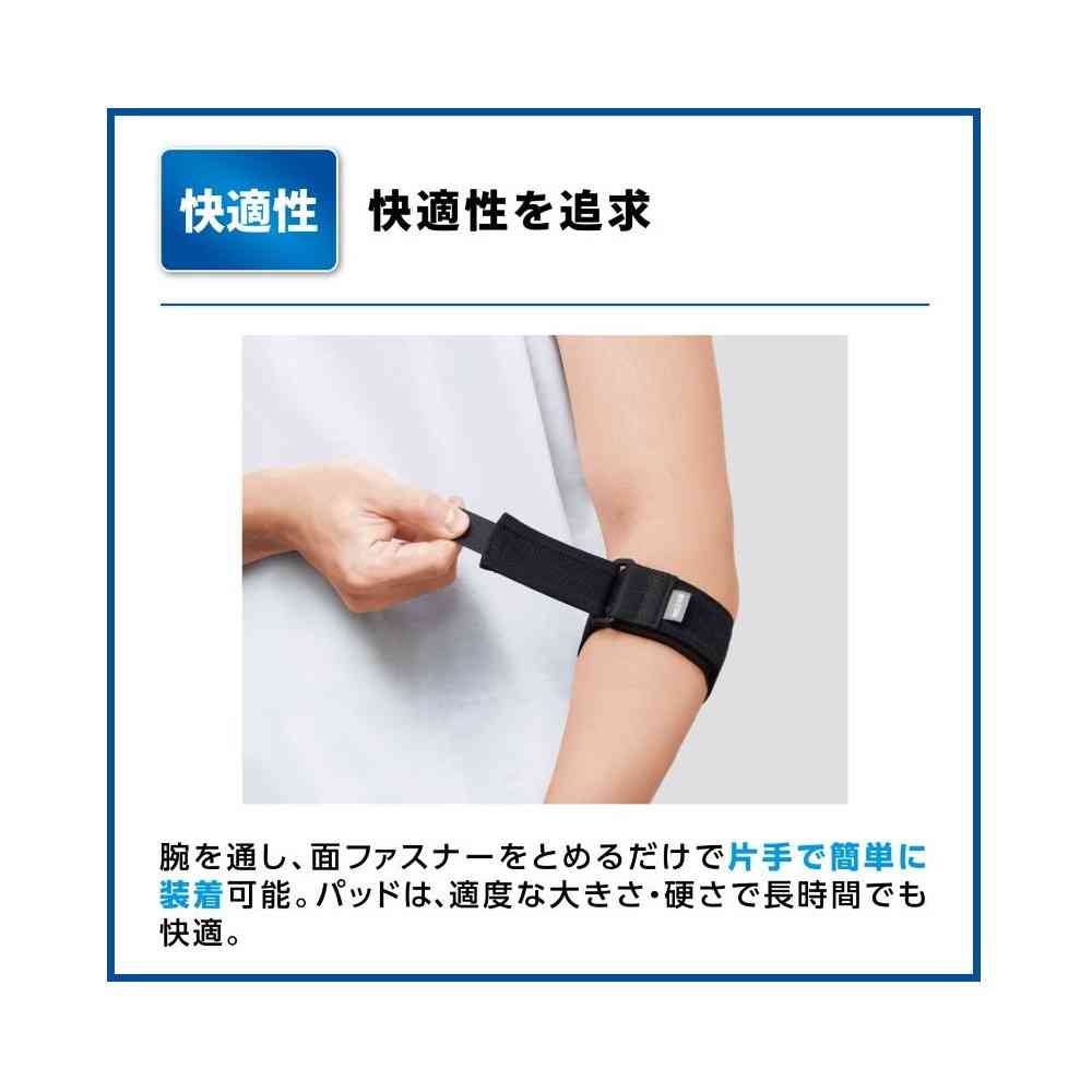 整形医療分野での50年にわたる実績をベースに開発した商品です。 肘の内側/外側のお悩みにオススメ。 パッドがしっかり圧迫することで、負担を軽減。 テニスやゴルフ等のスポーツ時だけでなく、日常生活や仕事時も活躍。 (1)パッドによる圧迫で肘への負担を軽減 パッドの位置の調節により、肘の内側・外側どちらにも対応可能。 (2)ストラップでお好みの圧迫力に調節可能 アジャスター付きストラップでお好みの圧迫力に簡単に調節ができ、しっかりフィット。 (3)快適性を追求 腕を通し、面ファスナーをとめるだけで片手で簡単に装着可能。 パッドは、適度な大きさ・硬さで長時間でも快適。