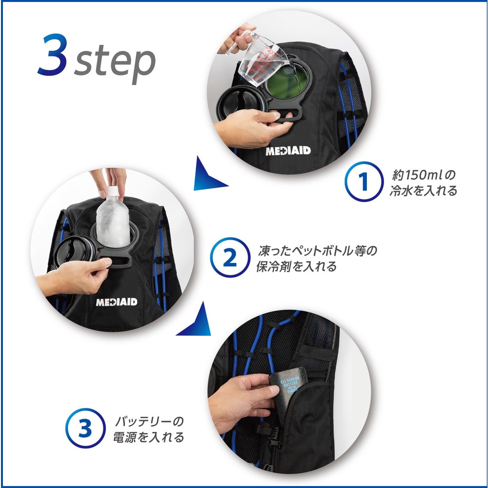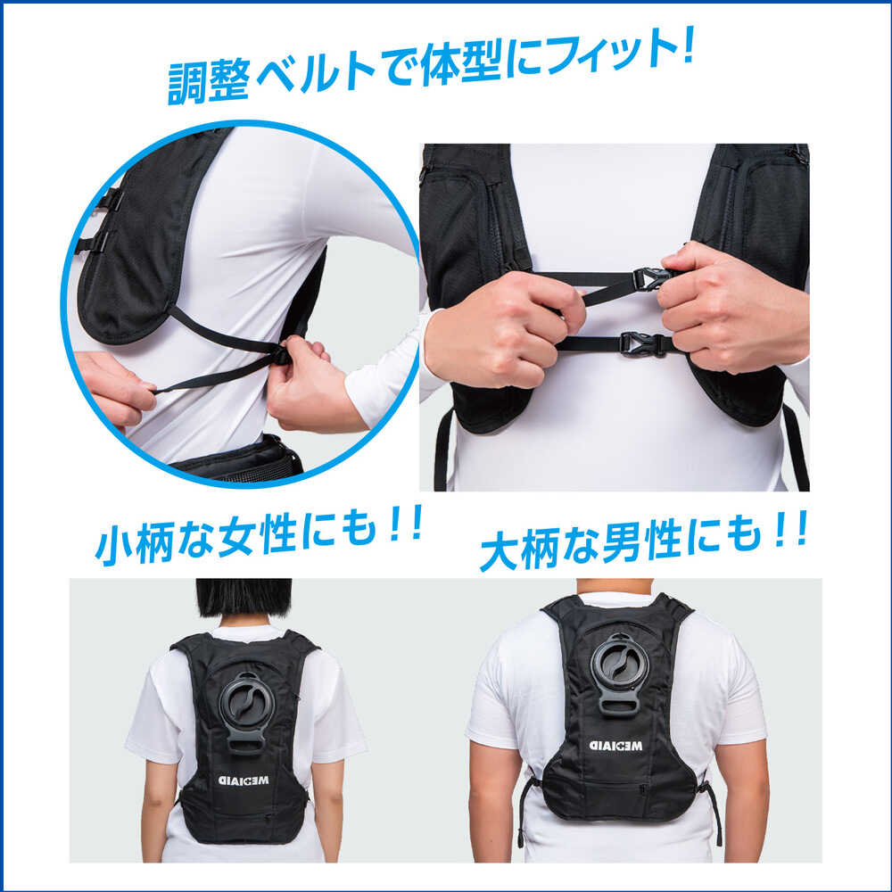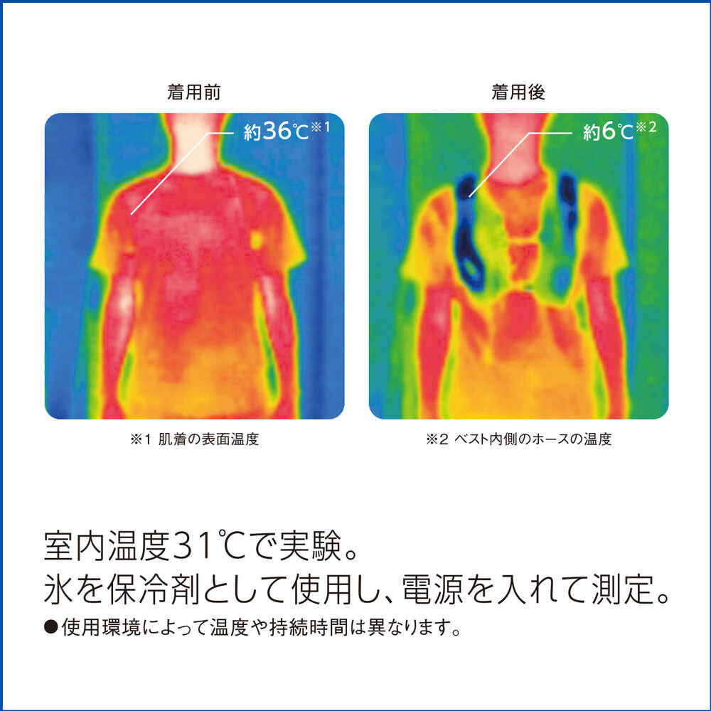 ●酷暑環境でも積極冷却。●作業動作を妨げないフィット性を備えたタンク一体型水冷服。●【速攻冷感】タンクに少量の水(約150ml)と保冷材を入れ、バッテリーをONにすると、ベスト内側のホースの冷水が流れ、すぐに冷えを感じることができます。●保冷材は、凍ったペットボトルでも氷でもOK。●【快適設計】ベストが体にフィットするため重さを感じにくく、普段の作業動作を妨げません。●ファンが無く、動作音が気になりにくい。●(静音設計)●【繰り返し簡単使用】バッテリーは一日使用可能。●保冷剤を入れ替えるだけで数秒で冷感が復活し、快適に使用できます。●バッテリーは操作のしやすい前面収納。●色:黒●着丈(cm):43●胸囲(cm):80~130●肩幅(cm):30 質量675g