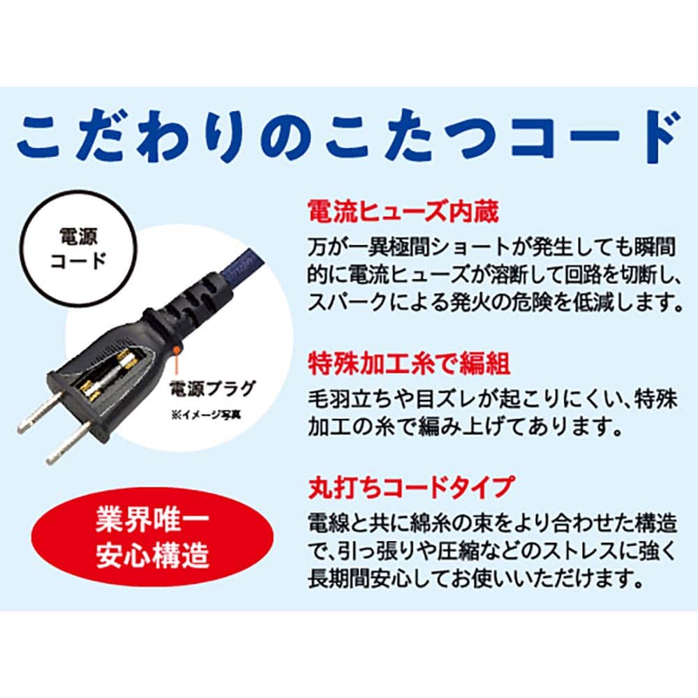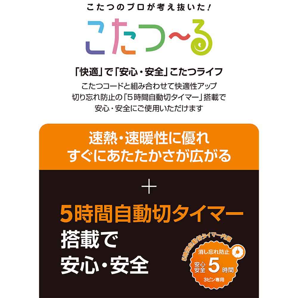 すぐに暖かさが広がる「速暖モデル」 ● すぐに暖かさが広がる 速熱・速暖性に優れるU字形ハロゲンヒーターで、こたつ内部を素早く暖めます。 ● 温風ファンでこたつ内をムラなく暖める 大きなこたつテーブルでも安定した暖かさを実現。 ● 長時間のご使用でも安心 万が一の切り忘れに配慮した5時間自動OFFタイマー付き。 仕様 ■ヒーター 型番:MHU-601ET(DKB) 電源:交流 100 V 50-60 Hz 消費電力:最大 600 W 最小 90 W ヒーター:U字形ハロゲンヒーター ファン・モーター:プロペラファン・誘導電動機 温度制御:感熱抵抗素子による位相制御 安全装置:(本体)温度ヒューズ/(電源コード)電流ヒューズ 標準寸法:幅29cm×奥行き29 cm×高さ4.1cm 標準重量:約1.5 kg コード:電子コントローラー(KET22D) 丸打ちコードタイプ3 m 1時間あたりの標準消費電力量:(強)約180Wh/(弱)約70Wh 1時間あたりの電気代:(強)約5.6円/(弱)約2.2円 製造国:マレーシア製 ※保証期間はお買い上げ日から1年間です