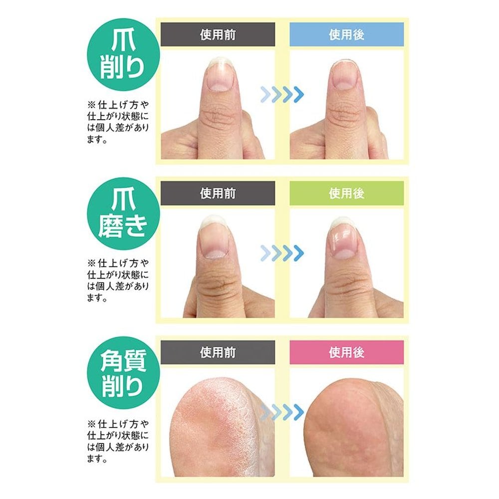 伸びた爪に押しあてるだけ!簡単&きれいに爪のお手入れ。ヘッドの付け替えで「爪削り」「爪磨き」「角質削り」の一台三役。電動式(乾電池)でスピーディーにケアできます。爪削りは伸びた爪に押しあてるだけ。硬い足の爪も回転刃がスイスイ削ります。自然なカーブを描く美しい仕上がり。2種のヤスリの使い分けで爪の表面を整え、ツヤツヤの美爪に。角質削りは硬い角質に対応するダイヤモンドパウダーを配合。スピーディーに削り、なめらかに仕上げます。■角質削りヘッドダイヤモンドパウダー配合優しく撫でるだけでなめらかなかかとへ。■爪削りヘッド回転刃が爪を削って長さを整えられます。「普通の爪切りだと握る力がいるので大変」「震える手では恐い」という方には特におすすめ。■爪磨きヘッド爪の表面の凹凸を整えられる粗目のヤスリと、表面をツヤツヤに仕上げる磨き用のヤスリの2WAYタイプ。・表面整え用ヤスリ(グレー)爪の形や表面の凹凸を整えます。・磨き用ヤスリ(白)爪の表面をツルツルに仕上げます。