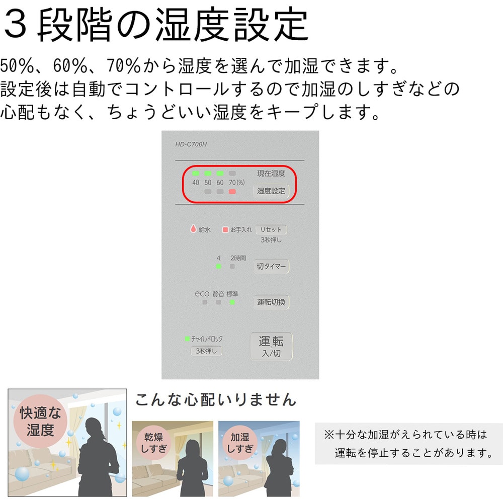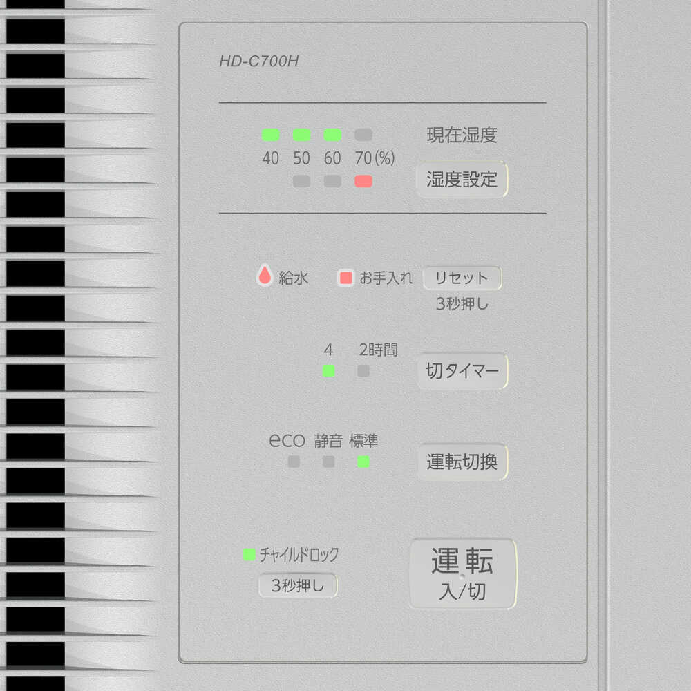 ●目に見えない細かな水粒子で、空間を隅々まで加湿します。●気化式と温風気化式のハイブリッド式なので、乾燥している時は素早く加湿し、湿度が安定すると運転を抑え経済的な運転を行います。●50~70%の10%単位でお好みの湿度を設定できます。●湿度センサーにより、設定した湿度を保つように自動で運転状態をコントロールします。●eco運転で消費電力は14~18Wです。●電源(V):単相100●加湿能力(L/h):700●消費電力(W)(50/60Hz):285/285●タンク容量(L):4.7●色:マットグレー●幅(mm):375●奥行(mm):210●高さ(mm):375●電源コード長さ(m):2.0●加湿能力(ml/h):700●連続加湿時間(h):6.7●使用範囲目安:木造12畳、プレハブ19畳●標準消費電力料金(50Hz):8.8円/h●標準消費電力料金(60Hz):8.8円/h●加湿方式:気化ハイブリッド式●運転モード:標準/静音/eco●湿度設定:50%/60%/70%●現在湿度表示:LED表示●湿度センサー搭載●切タイマー:2時間/4時間●半透明白色タンク 質量5.1kg