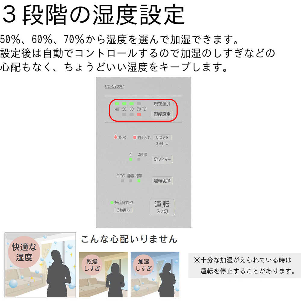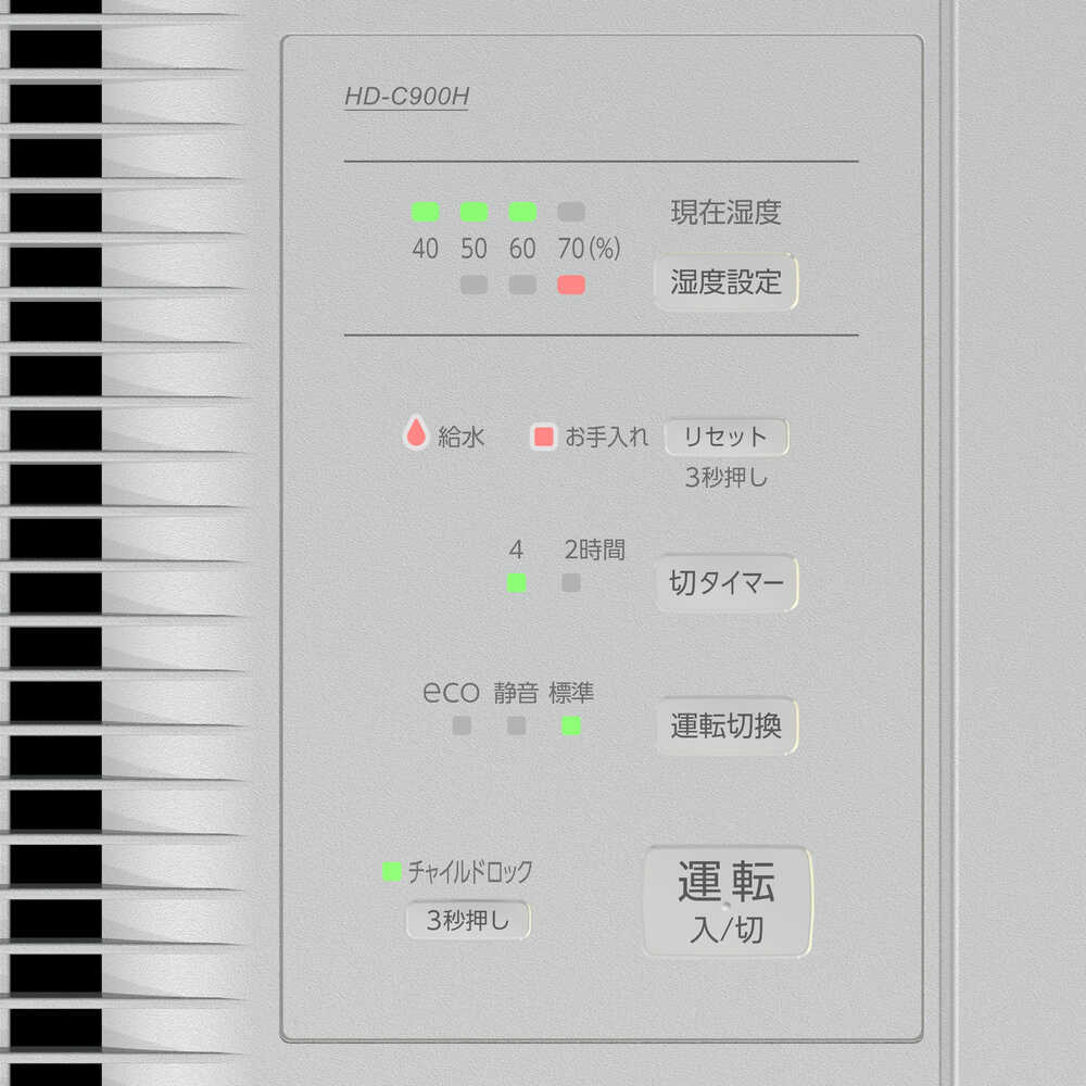 ●目に見えない細かな水粒子で、空間を隅々まで加湿します。●気化式と温風気化式のハイブリッド式なので、乾燥している時は素早く加湿し、湿度が安定すると運転を抑え経済的な運転を行います。●50~70%の10%単位でお好みの湿度を設定できます。●湿度センサーにより、設定した湿度を保つように自動で運転状態をコントロールします。●eco運転で消費電力は14~18Wです。●電源(V):単相100●加湿能力(L/h):860●消費電力(W)(50/60Hz):470/470●タンク容量(L):4.7●色:マットグレー●幅(mm):375●奥行(mm):210●高さ(mm):375●電源コード長さ(m):2.0●加湿能力(ml/h):860●連続加湿時間(h):5.5●使用範囲目安:木造14.5畳、プレハブ24畳●標準消費電力料金(50Hz):14.5円/h●標準消費電力料金(60Hz):14.5円/h●加湿方式:気化ハイブリッド式●運転モード:標準/静音/eco●湿度設定:50%/60%/70%●現在湿度表示:LED表示●湿度センサー搭載●切タイマー:2時間/4時間●半透明白色タンク 質量5.1kg