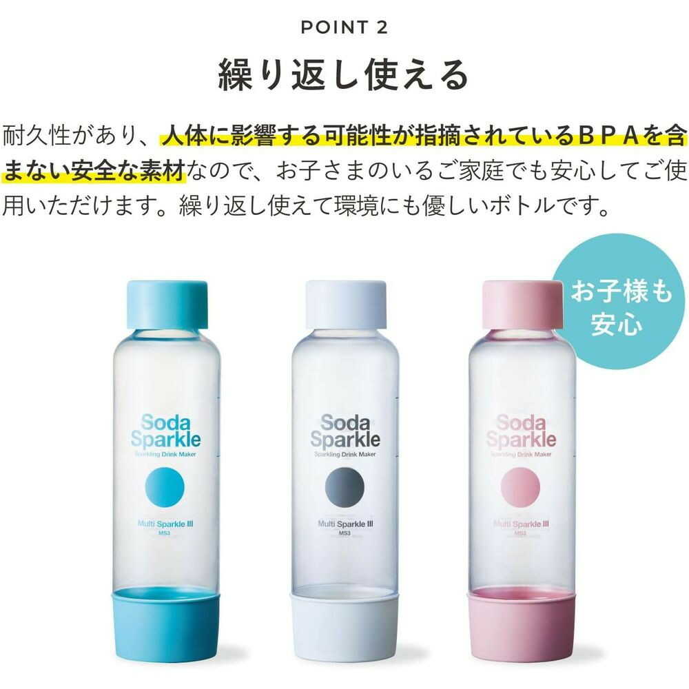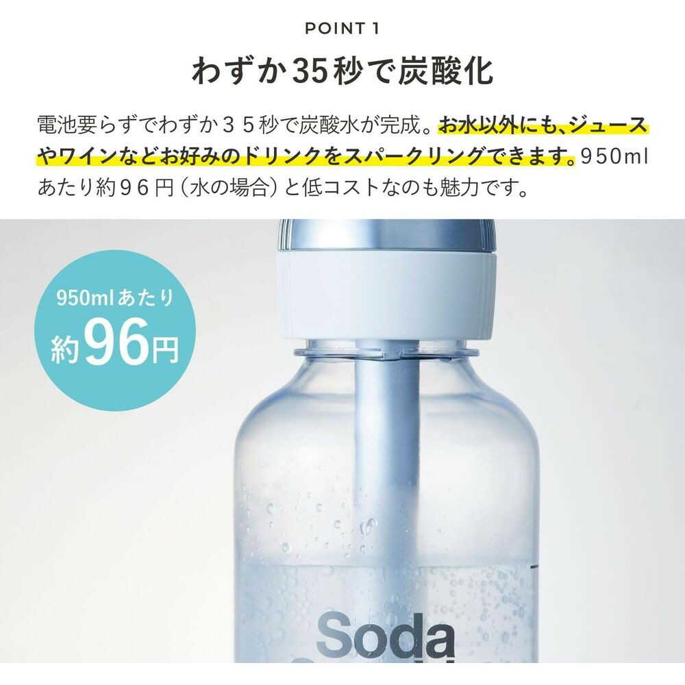 ●ガスカートリッジを使用のため電源不要。 ●水だけでなく、ジュースやお酒にも炭酸を注入可能。 ●繰り返し使えるボトルでプラスチックゴミを削減。 ●持ち運びやすく、収納にも便利なコンパクト設計。