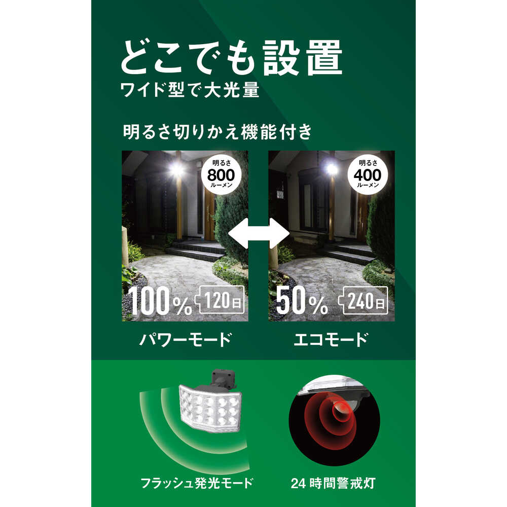 ●1灯タイプながらワイドな形状で広範囲を照らすことができます。●乾電池タイプなので電源コンセントは不要、配線いらずで簡単に設置できます。●フラッシュ発光モード(点滅)やセンサー部の赤色灯点滅でセキュリティ機能も高い製品です。●防犯・便利な照明としてお使いいただけます。●ライトの明るさを100%、50%の切り替えができます。●明るさ100%(800ルーメン)で明るさ重視、50%(400ルーメン)で点灯回数重視(乾電池を節約)となります。●フリーアーム式なので設置場所を選びません。●幅(mm):152●奥行(mm):139●高さ(mm):144●光源色:白●使用電球(W):9●消費電流(W):9●電源:単1形アルカリ乾電池×3本(別売)●点灯保持時間:10秒●明るさ(lm):800●電源(V):単1形アルカリ乾電池×3本(別売)●電池寿命:約4カ月(約120日)(100%点灯時)、約8カ月(約240日)(50%点灯時)●電球:電球種類9W×1(高輝度白色LED (設計寿命4万時間))●センサー:探知方式(焦電型赤外線センサー)●探知範囲(m):最大180°最遠8 質量380g