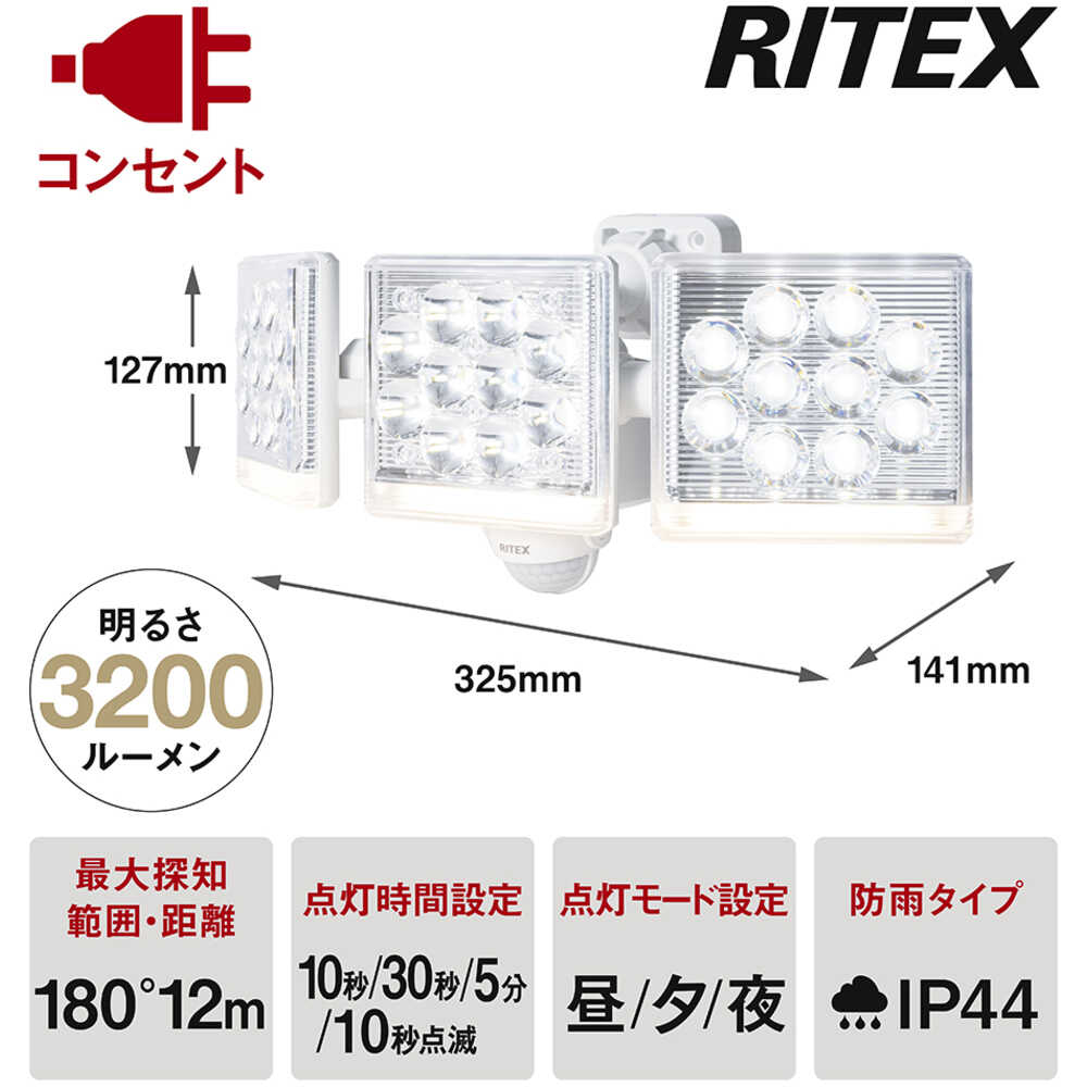 ●様々な設定をリモコンで遠隔操作できるセンサーライト(明るい白色灯、やさしい暖色灯、フラッシュ点滅+ブザー、投光器、常夜灯モード)です。●様々な設定をリモコンで遠隔操作できるセンサーライト(明るい白色灯、やさしい暖色灯、フラッシュ点滅+ブザー、投光器、常夜灯モード)取り付け可能です。●照射角度も自由自在です。●幅(mm):325●奥行(mm):141●高さ(mm):127●光源色:白色・電球色●使用電球(W):12×3灯●消費電流(W):点灯時:37W(全灯)、25W(暖色灯)、2.2W(常夜灯)/待機時:1W以下●電源:AC100V●点灯保持時間:10秒/30秒/5分/10秒フラッシュ●明るさ(lm):3200●明るさ:3200●電源(V):AC100V●保護等級:IP44●明るさ:3200lm●探知距離:12m●探知範囲:180° 質量1110g