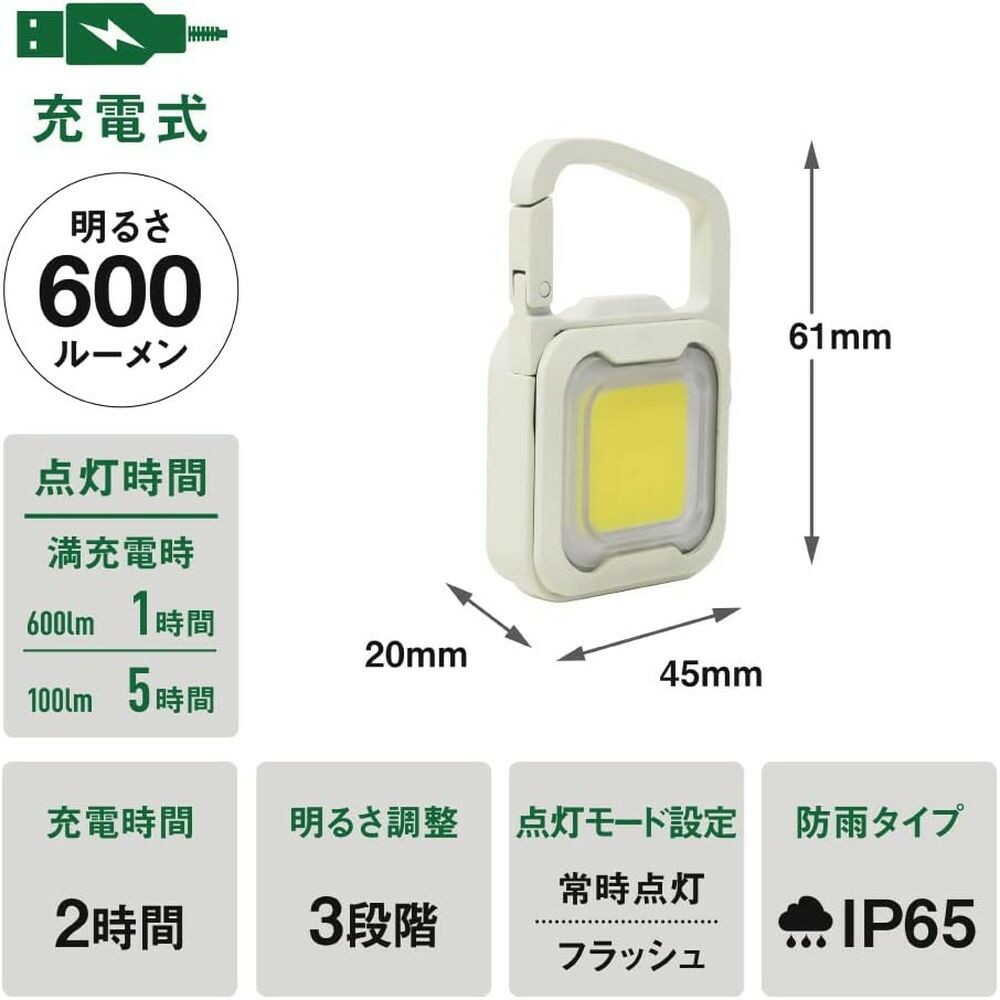 ●6WのLEDを採用し3段階の明るさ調整可能。 ●カラビナ、クリップ、マグネットを備えており、さまざまな場所に簡単に取り付け可能。 ●防塵・防水設計。 ●リチウムイオン電池(3.7V/500mAh)を内蔵し、USBType-C端子で充電可能。