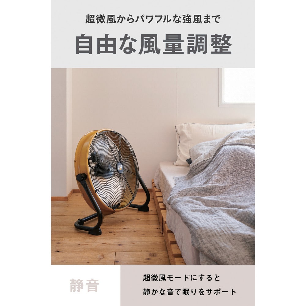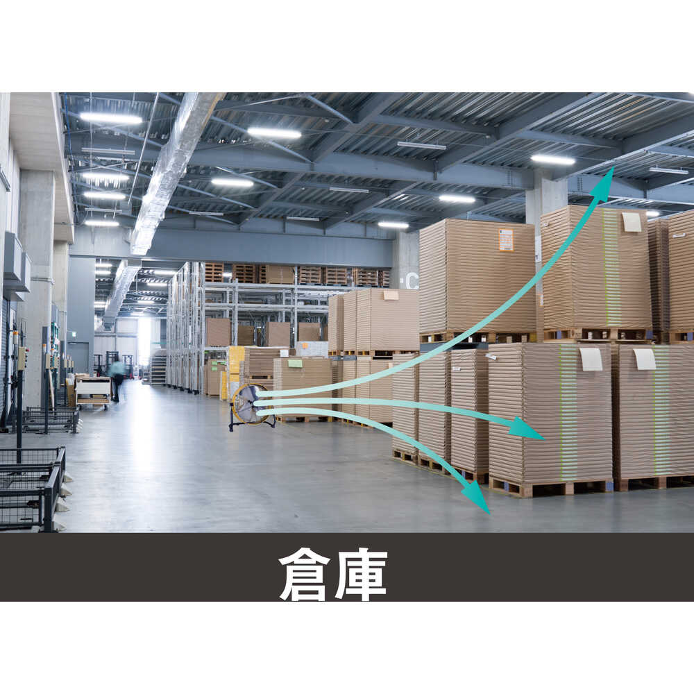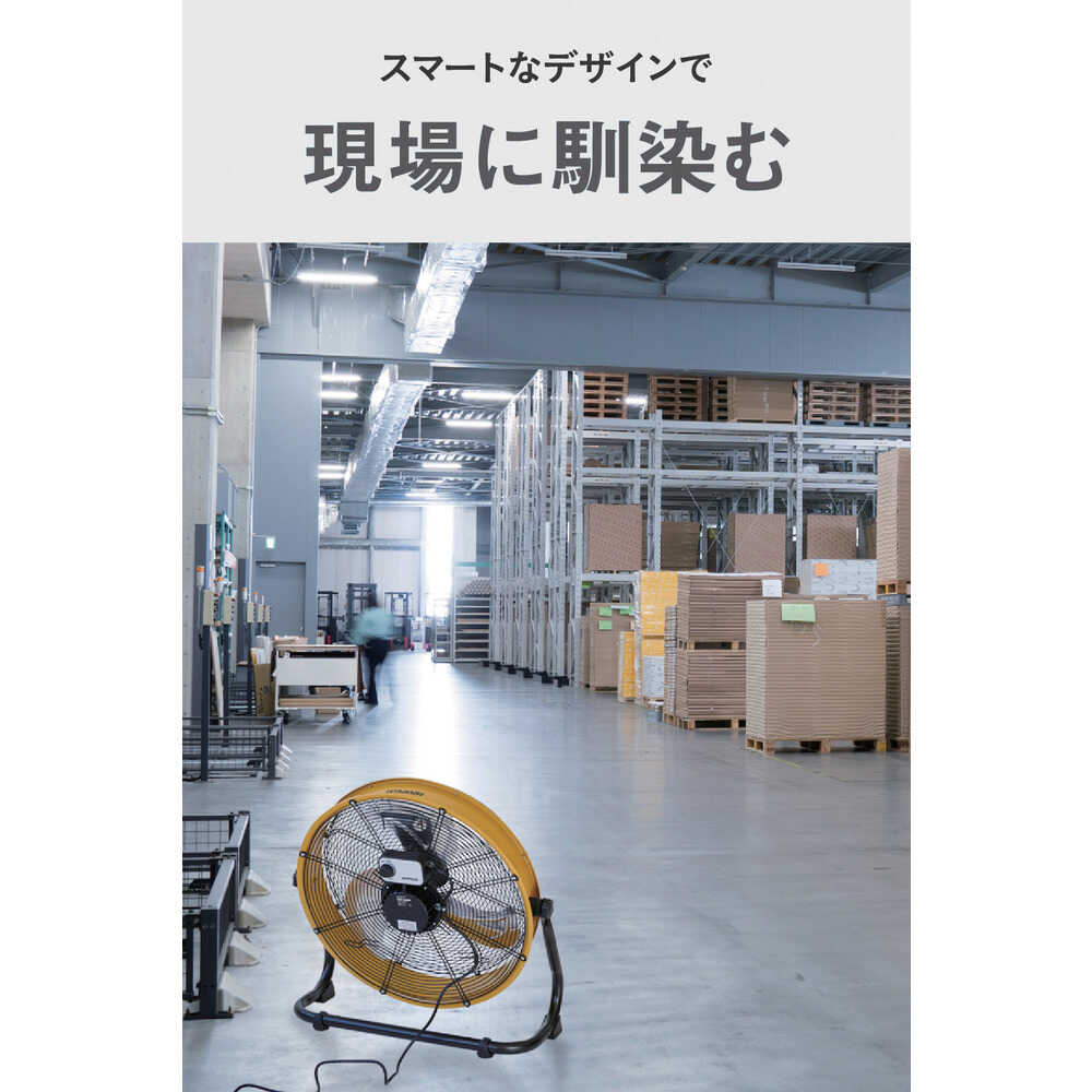 ●DCモーター採用で、ACモーターに比べて40~60%省エネを実現しました。●金属ドラム式の形状なので衝撃に強いです。●家庭用扇風機と比べてハネが大きく、大風量です。●様々な環境での使用を想定し、耐久性の高い設計です。●広範囲にやさしい風を大量に送ります。●直接風を感じる範囲が広いので、風の届かないところでも体感温度を下げることができます。●空間の広い施設では、エアコンの冷気を隅々まで行きわたらせ、効率的に温度を下げることができます。●高い耐久性で日光にも劣化しないアルミハネです。●真上にも真下にも向けられ、床置き・壁掛けも可能です。●電源(V):単相100~240●消費電力(W)(50/60Hz):96/96●ハネ径(cm):50●幅(mm):640●奥行(mm):260●高さ(mm):620●電源コード長さ(m):2●設置タイプ:壁掛け・床置き●色:イエロー●ハネ材質:アルミ●首振り:無●風量調節:無段階●最大風量([[M3]]/min)(50Hz):135●最大風量([[M3]]/min)(60Hz):135●標準消費電力料金(50Hz):2.9円/h 質量6kg