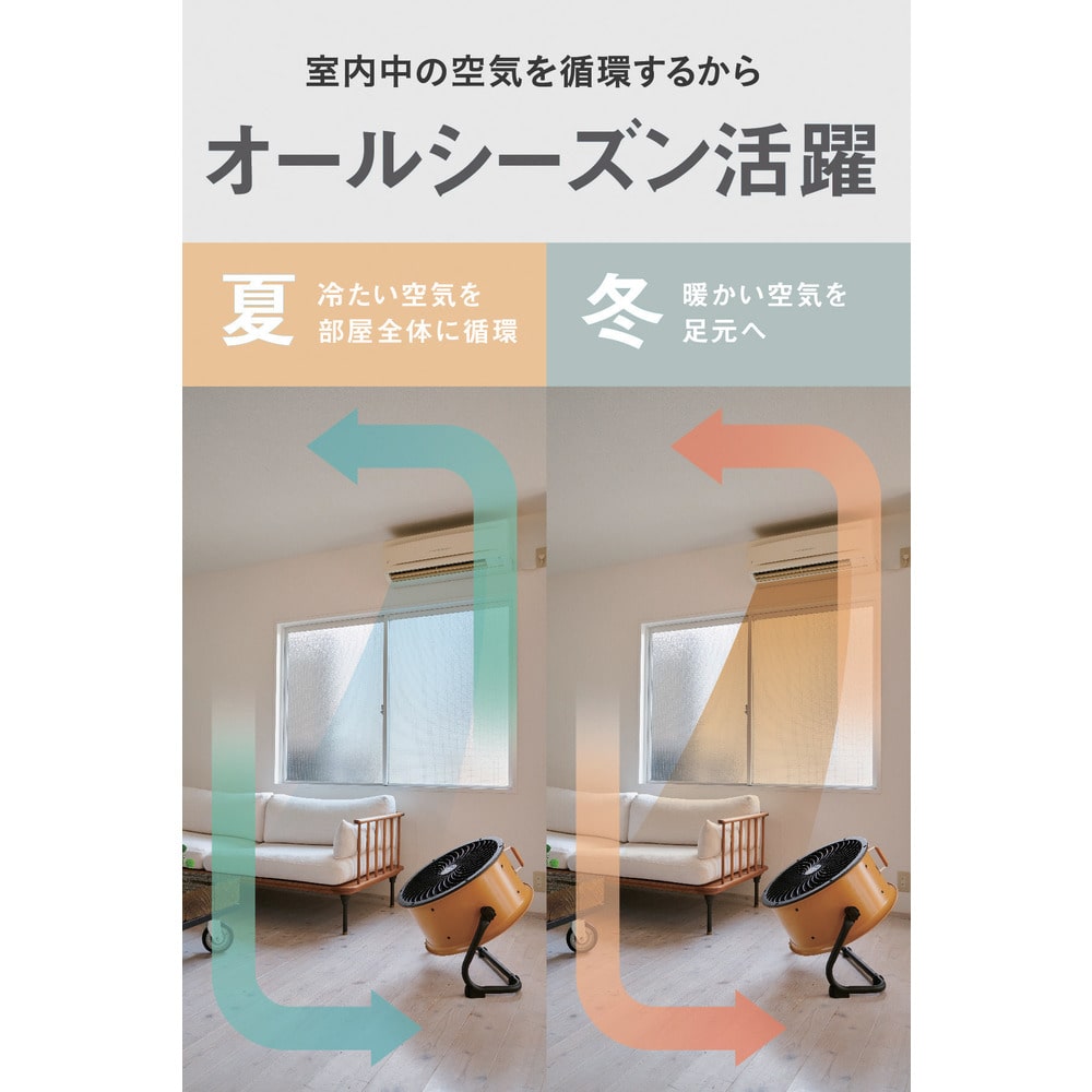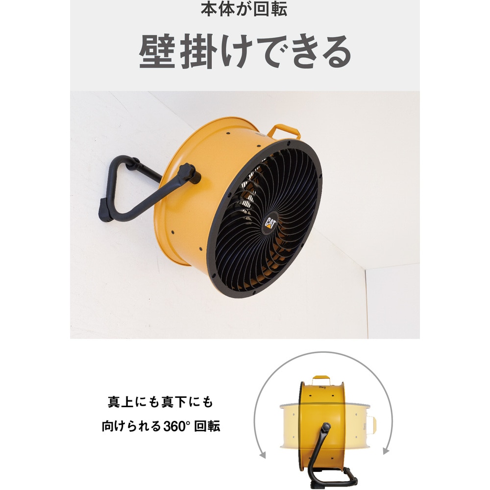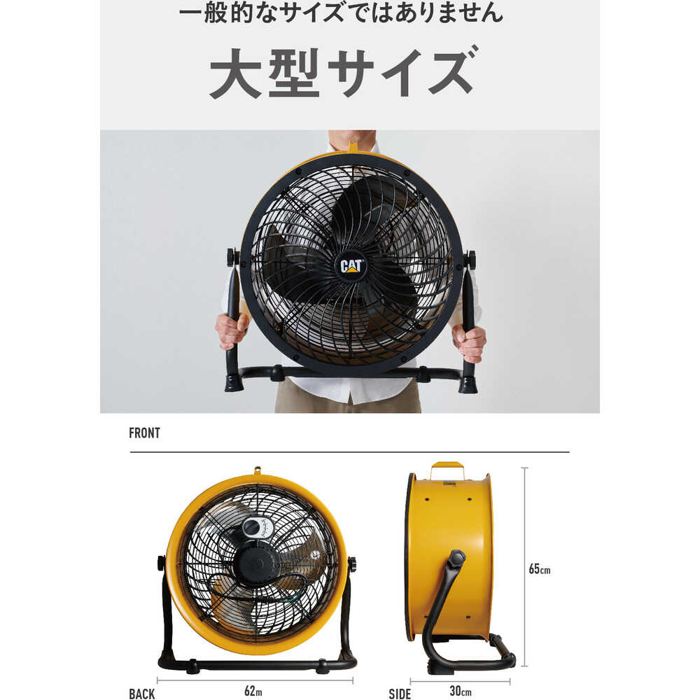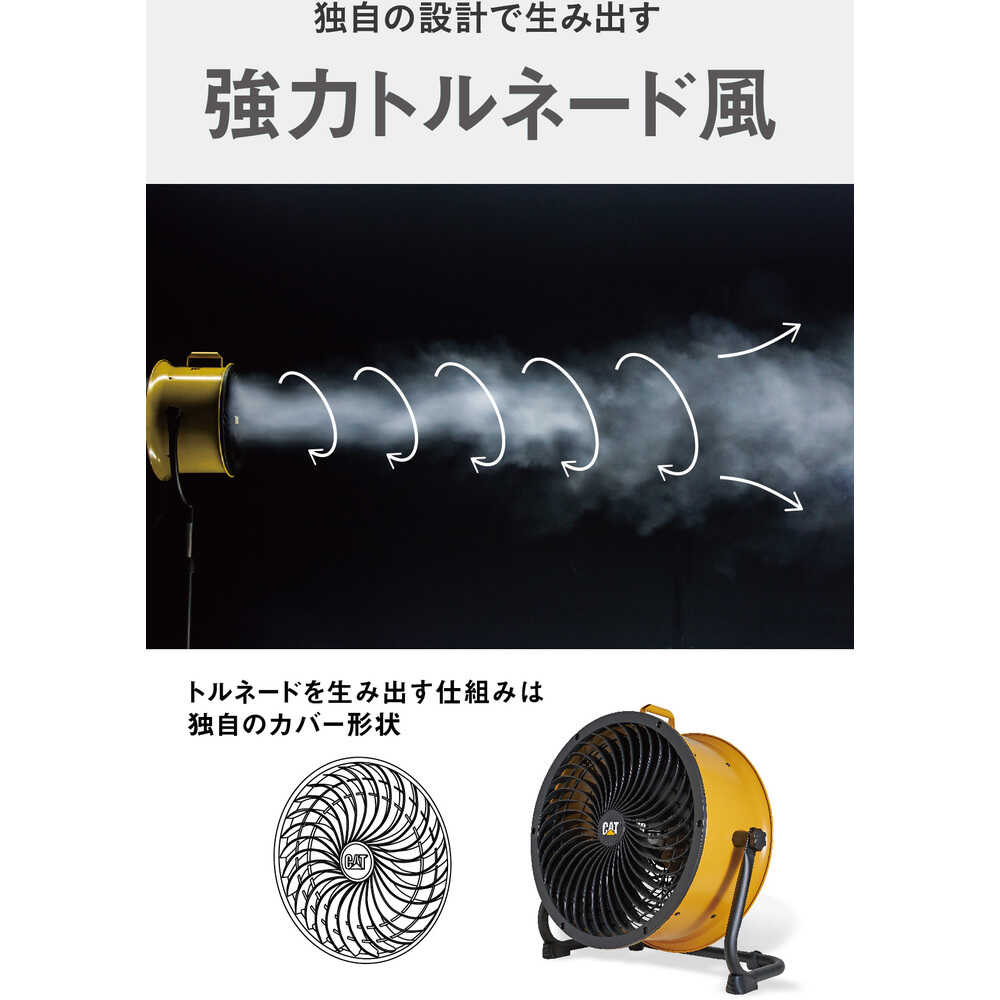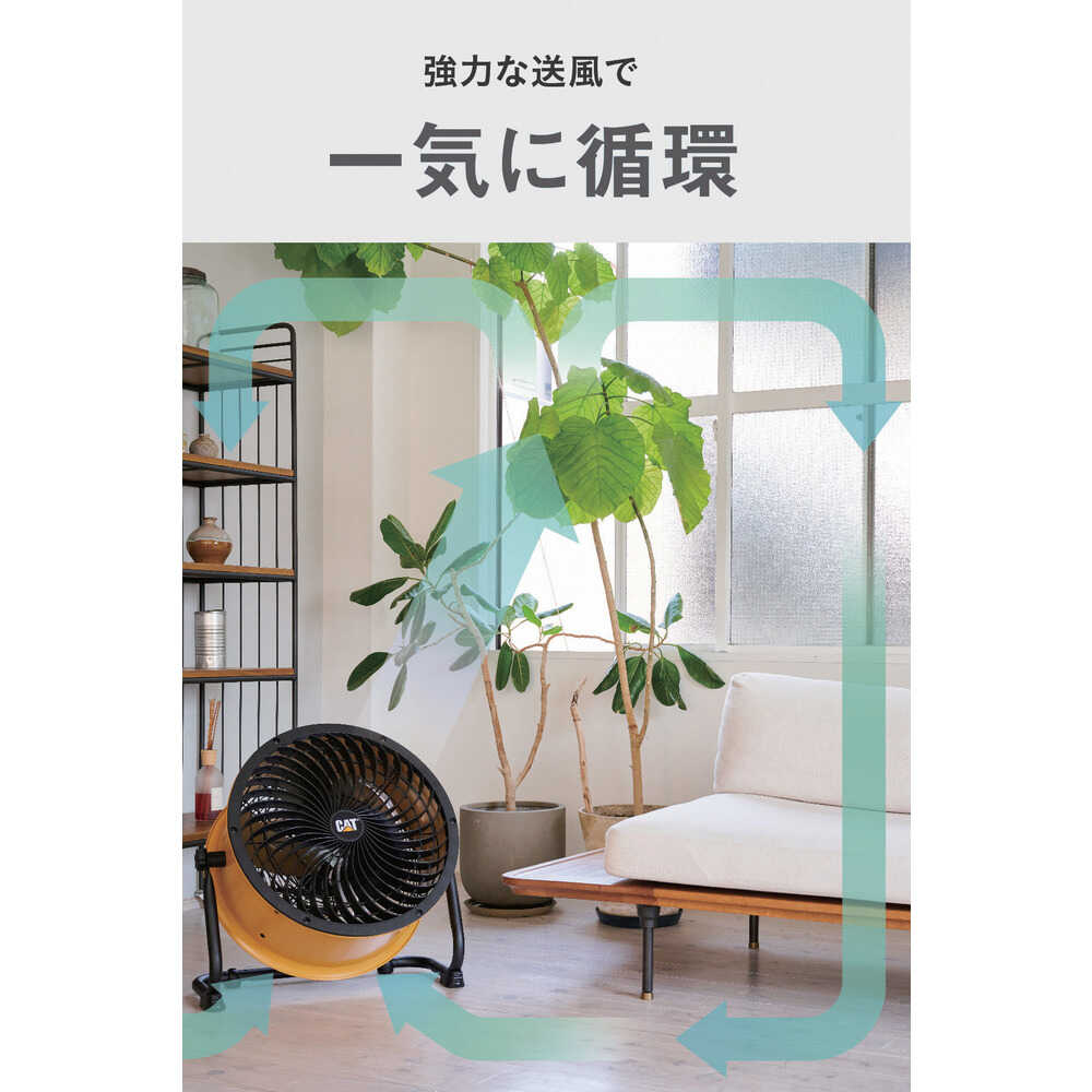 ●世界3000万台の実績のCATブランドのサーキュレーターです。●強いトルネード気流で室内の空気を循環させます。●360度上下に回転するため、空気循環の換気にも使用可能です。●全閉型モーターで粉塵やゴミの侵入を防ぎます。●アルミ羽根により高い耐久性を実現しました。●窓の外へ向けて排気すると、離れた場所の窓から新鮮な空気を取り込みます。●電源(V):単相100●消費電力(W)(50/60Hz):100/120●ハネ径(cm):45●幅(mm):620●奥行(mm):300●高さ(mm):650●電源コード長さ(m):1.8●設置タイプ:壁掛け・床置き●色:イエロー●ハネ材質:アルミ●首振り:無●風量調節:4段階●風量([[M3]]/min):145●最大風量([[M3]]/min)(50Hz):145●最大風量([[M3]]/min)(60Hz):145●標準消費電力料金(50Hz):3.1円/h●標準消費電力料金(60Hz):3.7円/h●モーター:全閉式●畳数目安:42畳 質量10kg