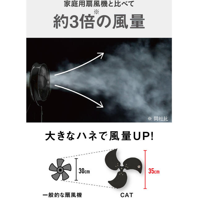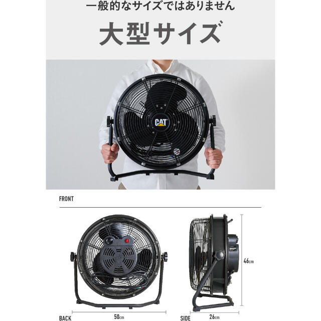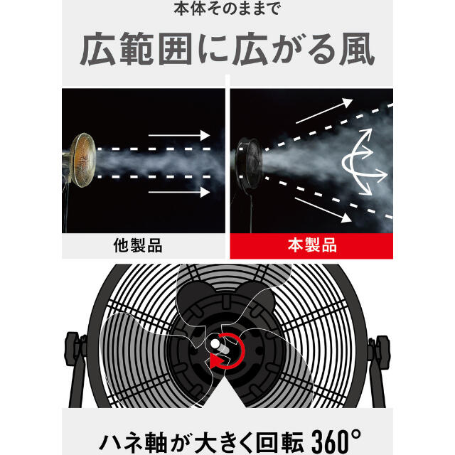 ●家庭用扇風機と比べてハネが大きく、大風量です。●様ーな環境での使用を想定し、耐久性の高い設計です。●広範囲にやさしい風を大量に送ります。●直接風を感じる範囲が広いので、風の届かないところでも体感温度を下げることができます。●空間の広い施設では、エアコンの冷気を隅ーまで行きわたらせ、効率的に温度を下げることができます。●高い耐久性で日光にも劣化しないアルミハネです。●真上にも真下にも向けられ、床置き・壁掛けも可能です。●電源(V):単相100●消費電力(W)(50/60Hz):35/40●ハネ径(cm):35●幅(mm):500●奥行(mm):260●高さ(mm):460●電源コード長さ(m):1.85●設置タイプ:壁・床●風量調節:3段階●首振り:あり●風量([[M3]]/min):56●標準消費電力料金(50Hz):1.1●標準消費電力料金(60Hz):1.2●最大風量([[M3]]/min)(50Hz):56●最大風量([[M3]]/min)(60Hz):56●色:ブラック●畳数目安:12畳●タイプ:羽根軸360°半転機能付き●モーター:開放式●畳数目安:12畳 質量4.7kg