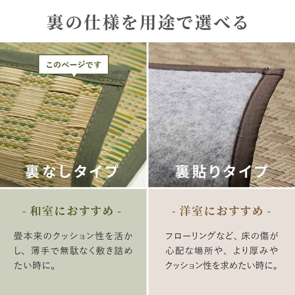 濃いめの染めい草を使った和モダンでおしゃれな、市松柄のい草カーペット。「若月シリーズ」は、お部屋のラグとしてや、畳を保護する上敷きとしてなどの豊富なサイズバリエーションに、用途にあわせて裏地の有無もお選びいただけます。こちらは薄手で扱いやすく、畳本来のクッション性を活かせるため和室におすすめな裏地なしタイプ。