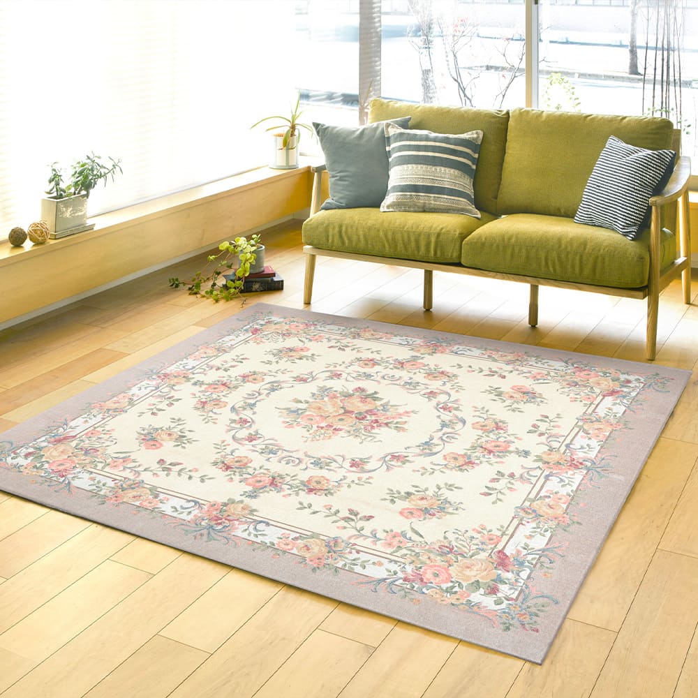 エレガントで上品な花柄のゴブランシェニールラグ。さらっとした肌触りで季節を問わずオールシーズンお使いいただけます。