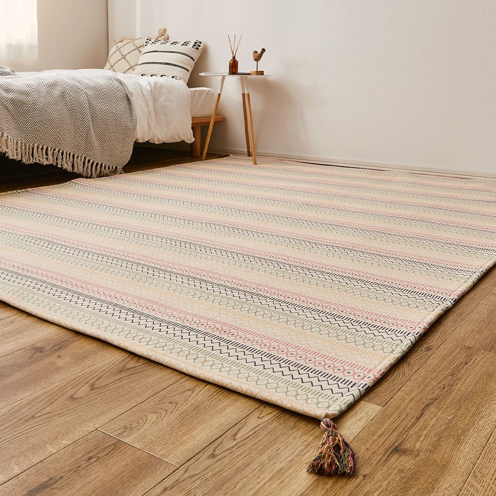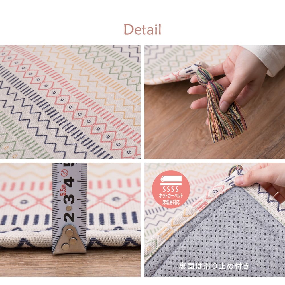 さらっとした踏み心地とインド綿ならではの素朴な仕上がりが魅力のラグ。四隅に付いたフサ(タッセル)でおしゃれ度アップ!吸湿発乾性が良く年中使えるタッチ感もインド綿の人気の秘密です。お客様のご要望に応えて、すべり止め付きを開発しました!