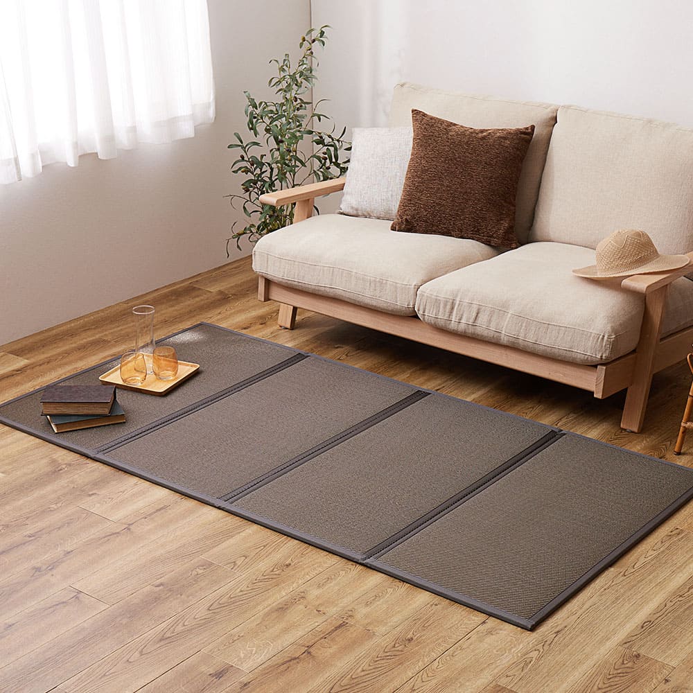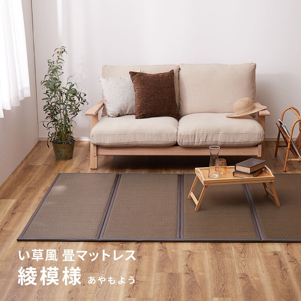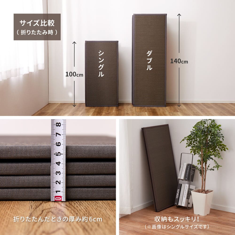 PP素材で汚れに強い、い草風の折りたためるマットレス。 急な来客など必要な時にもサッと取り出せ、パッと広げるだけ!折りたたんでコンパクトに収納できるので、出し入れもラクラク♪ フローリングと敷布団の間に敷けば、程よいクッション性で床の硬さを軽減してくれます。 マットレスとしてだけでなく、置き畳のようにもお使いいただけます。複数枚を並べて敷けば、広々とした畳スペースに。