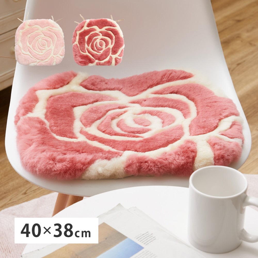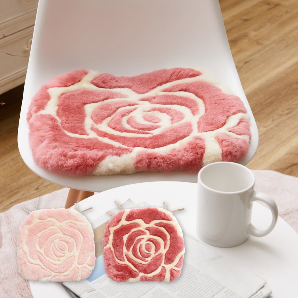 エレガントなローズデザインのシートクッション。天然素材のムートンは、吸水性、放湿性に優れ、火にも強く、燃え広がりにくい、まさに呼吸する素材。表面は水を弾く性質もあり、自然の効力をもった人にやさしい万能素材です。包み込まれるようにやわらかで、優しいぬくもりがあふれるタッチ感は、化学繊維とは異なる特別な感触です。中材にはウレタンフォームを使用しているのでクッション性があり、床やソファ、車のシートなど様々な場所で大活躍!
