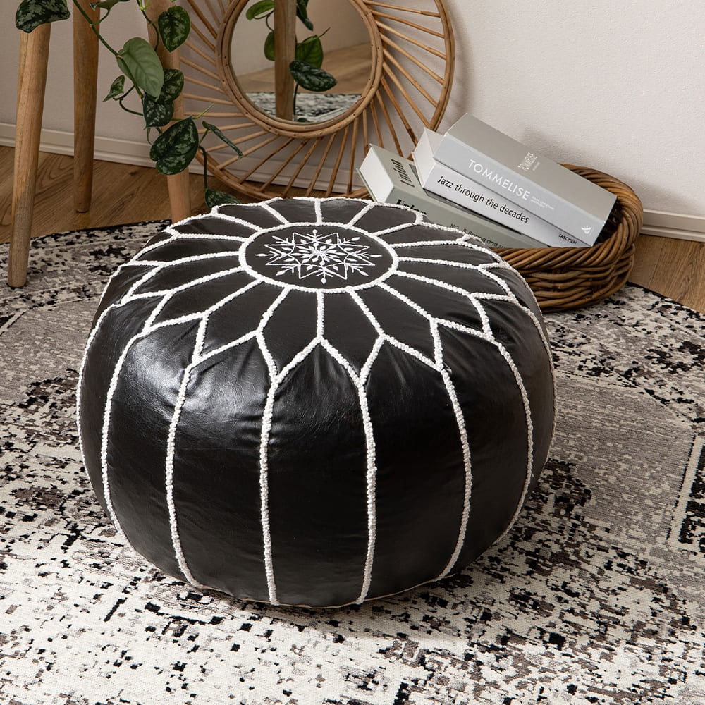 フェイクレザーにモロッカンデザインの刺繍を施したおしゃれなプフ。ころんとしたフォルムが特徴的なプフは、お部屋に置いておくだけでかわいいインテリアアイテムです。スツールとして座ったり、サイドテーブルや肘掛け、オットマンとしてなど使い方いろいろ。中材には発泡ビーズを使用しており、軽くて持ち運びやすいのもうれしいポイントです。底面にはビーズを補充できるファスナー付きで、中身がへたってきたら市販のビーズを追加することができます。