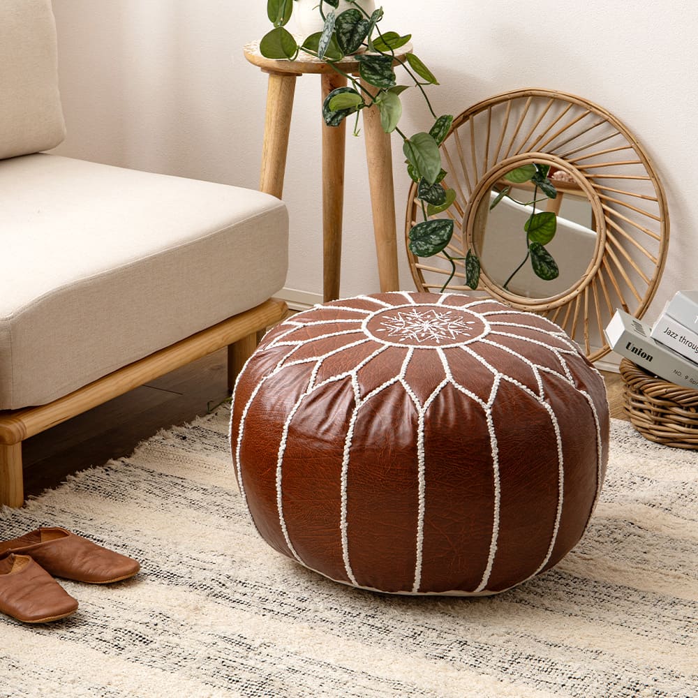 フェイクレザーにモロッカンデザインの刺繍を施したおしゃれなプフ。ころんとしたフォルムが特徴的なプフは、お部屋に置いておくだけでかわいいインテリアアイテムです。スツールとして座ったり、サイドテーブルや肘掛け、オットマンとしてなど使い方いろいろ。中材には発泡ビーズを使用しており、軽くて持ち運びやすいのもうれしいポイントです。底面にはビーズを補充できるファスナー付きで、中身がへたってきたら市販のビーズを追加することができます。