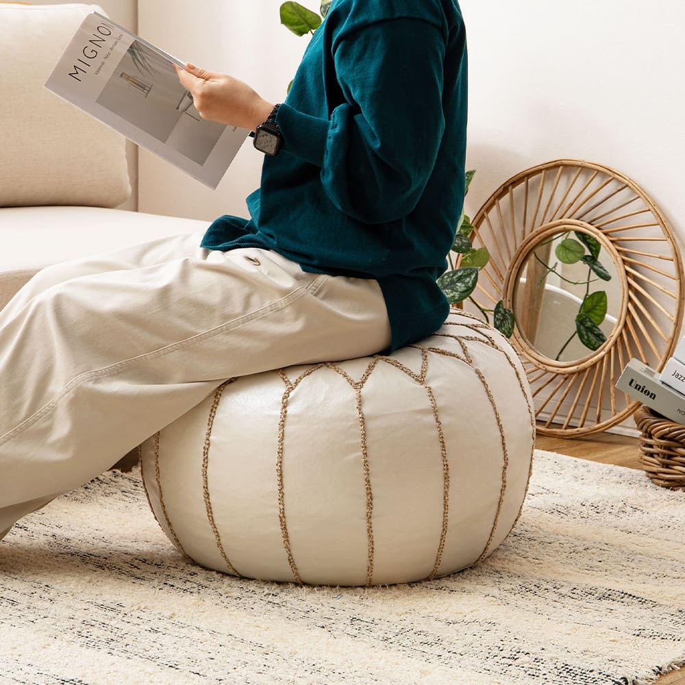 フェイクレザーにモロッカンデザインの刺繍を施したおしゃれなプフ。ころんとしたフォルムが特徴的なプフは、お部屋に置いておくだけでかわいいインテリアアイテムです。スツールとして座ったり、サイドテーブルや肘掛け、オットマンとしてなど使い方いろいろ。中材には発泡ビーズを使用しており、軽くて持ち運びやすいのもうれしいポイントです。底面にはビーズを補充できるファスナー付きで、中身がへたってきたら市販のビーズを追加することができます。
