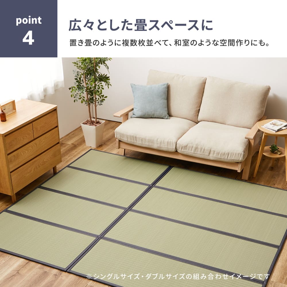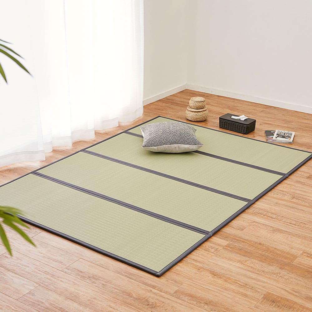 PP素材で汚れに強い、い草風の折りたためるマットレス。 急な来客など必要な時にもサッと取り出せ、パッと広げるだけ!折りたたんでコンパクトに収納できるので、出し入れもラクラク♪ フローリングと敷布団の間に敷けば、程よいクッション性で床の硬さを軽減してくれます。 マットレスとしてだけでなく、置き畳のようにもお使いいただけます。複数枚を並べて敷けば、広々とした畳スペースに。