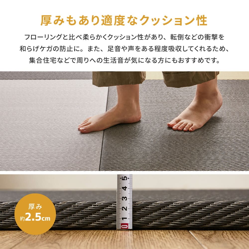 表がPP素材なので、ジュ-スなどをこぼしてもさっと拭き取れる子どもやペットのいるご家庭におすすめ。軽量で女性1人でも簡単に床に並べるだけで畳スペ-スが作れる置き畳です。ちょっとした隙間スペ-スを有効活用できるのでキッズ向けのプレイマットからシニアのお昼寝、お父さんお母さんのごろ寝スペ-スまで簡単に作れます。適度なくション性があり、階下への配慮や床のキズ防止など、子育て中にもうれしい便利グッズ。