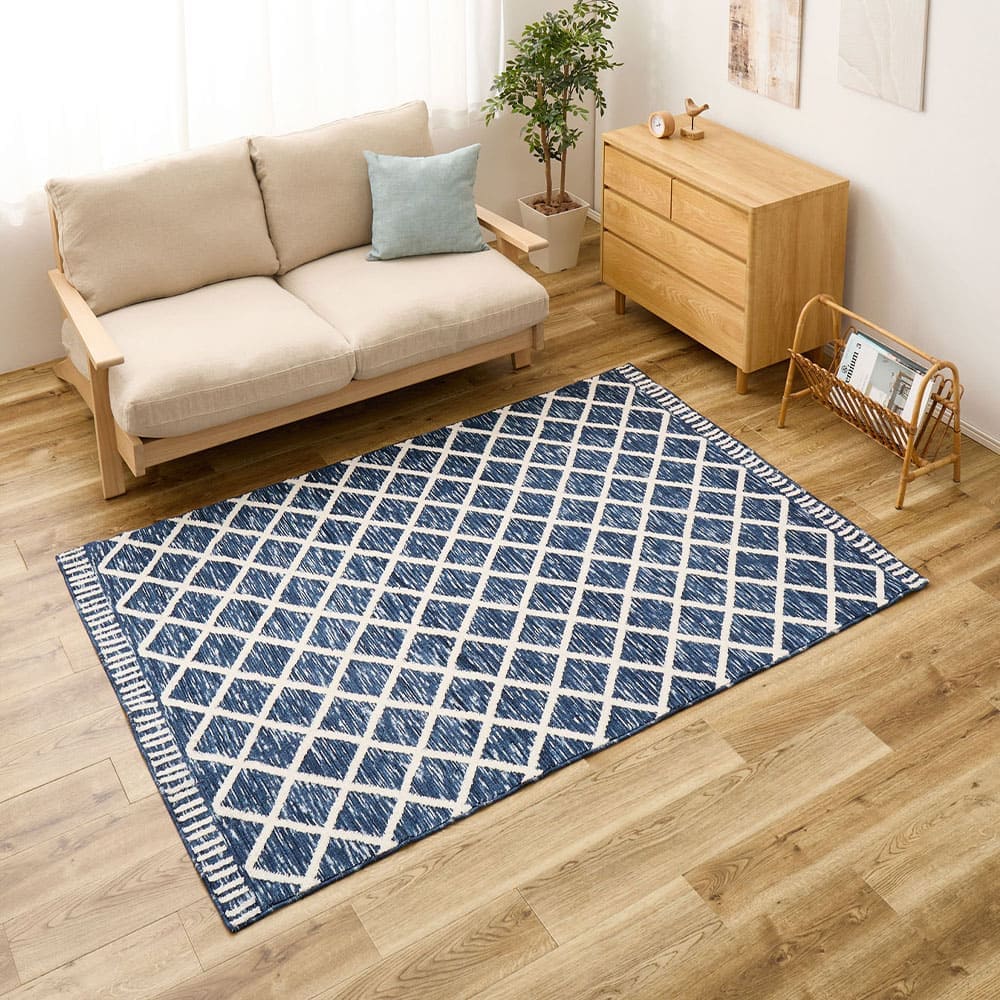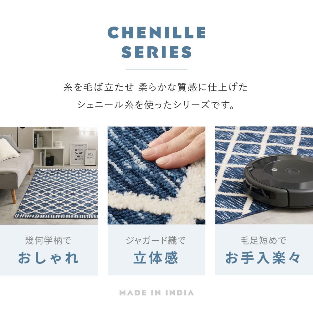 糸を毛羽立たせ柔らかな質感に仕上げたシェニール糸を使い、ジャガード織で繊細な模様を美しく表現した高級感のある一枚。 北欧、モロッコ、ベニワレンなど、人気の柄を掛け合わせた、どんなテイストにも馴染みやすいデザインです。掃除機もかけやすく、毛足が短いためゴミが溜まりにくいから日々のお手入れも簡単。裏面はラバー素材で、滑り止め効果がありズレにくいのも嬉しいポイントです。