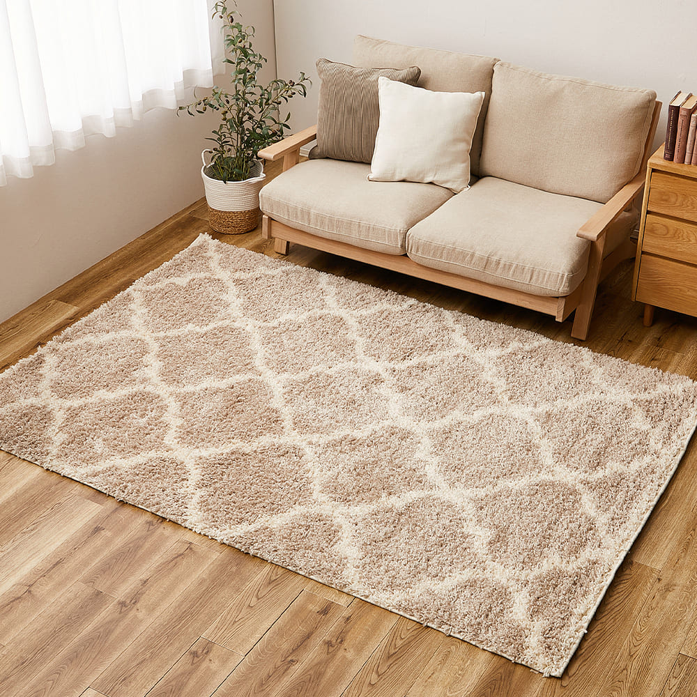 エジプト製のウィルトン織シャギーラグ。おしゃれなモダン柄とナチュラルなカラーでどんなインテリアにも合わせやすいデザインです。毛足が長くボリュームがあり、おもわず寝転びたくなるような心地良さの、ふわふわとやわらかな肌触り。また、ウィルトンラグはパイルの密度が高く耐久性に優れ、お気に入りのラグを長く使いたい方にもおすすめです。