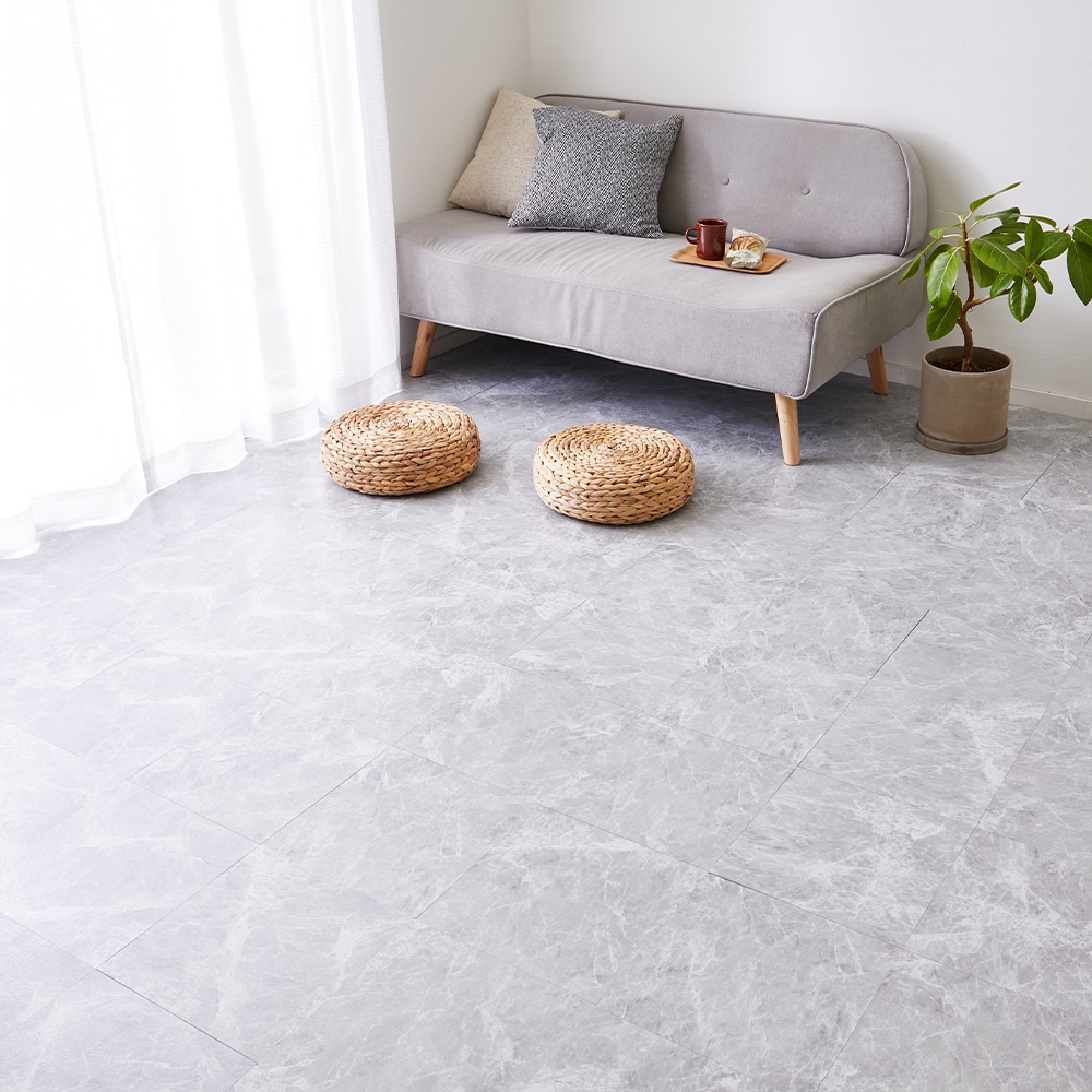 フィルムをはがして何度でもはがせる、ストーン調フロアタイル。床の上から貼るだけでお部屋をイメージチェンジできます。賃貸や新築の床への汚れや傷の防止にも。カッターで簡単にカットできます。キッチンや洗面所など水周りにも使えて、粘着が落ちても水で洗えば繰り返しご使用いただけます。