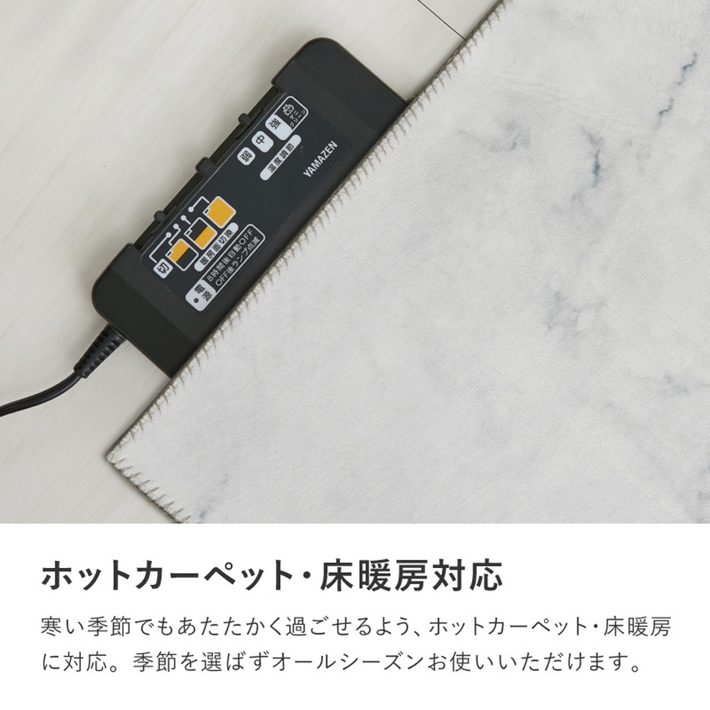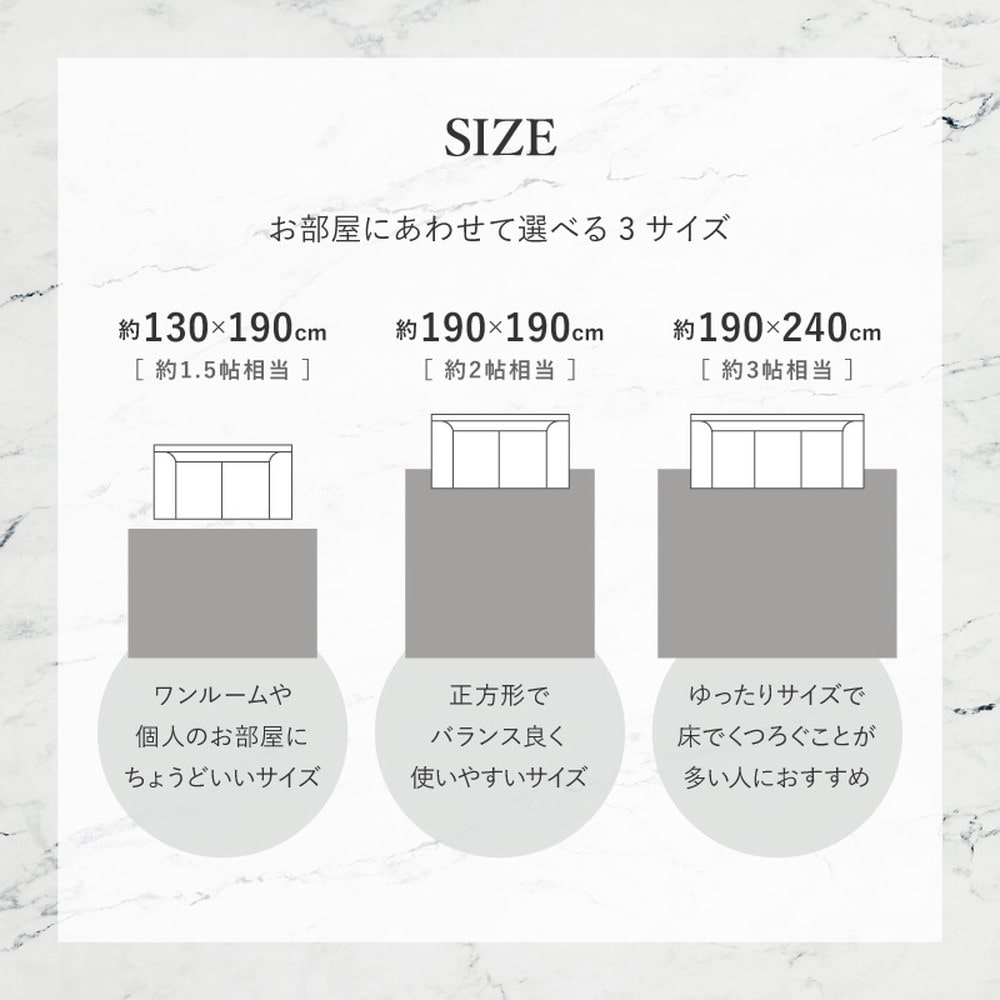 上品で高級感のある大理石柄のプリントラグ。海外風インテリアや、ホワイトコーデにもあうシックなデザインです。ソフトフランネルのなめらかな肌触りは、思わず素肌で触れたくなるようなタッチ感。短毛でやわらかく、コンパクトに折りたためるから収納にも困らず、お手入れも簡単。汚れても洗えるからいつも清潔にお使いいただけます。裏面には滑り止め付きでフローリングの上でもズレにくく安心。寒い季節もあたたかく過ごせるよう、ホットカーペット・床暖房に対応しています。