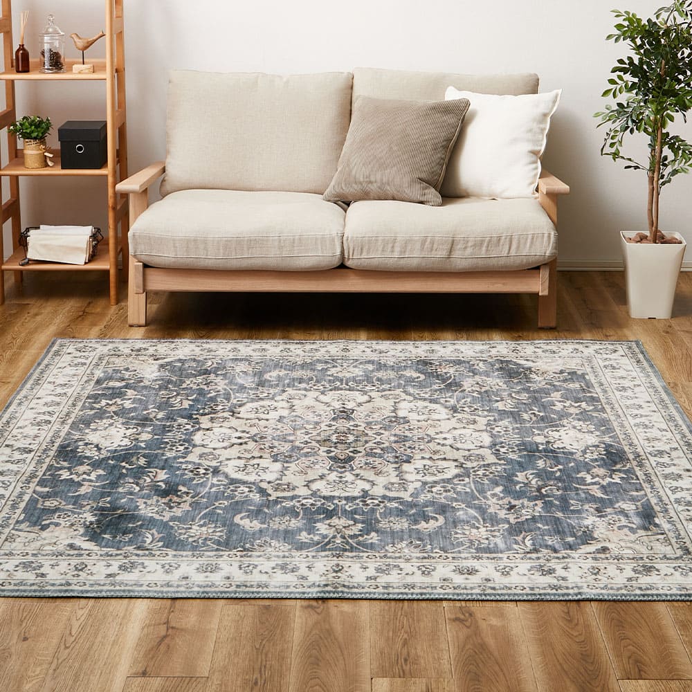 小さな模様や、ヴィンテージのようなかすれ感を細部までプリントで表現した、まるで高級ラグのような一枚。