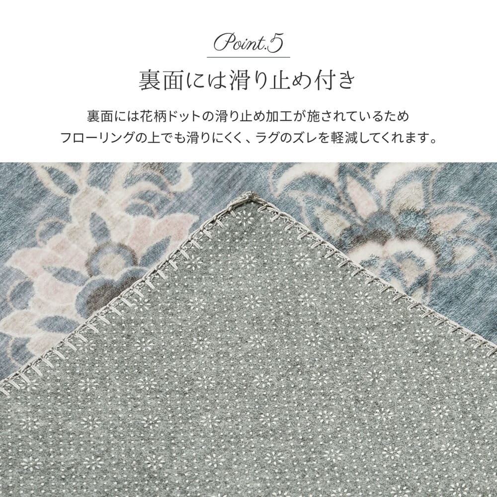 裏面は滑り止め付きで、フローリングの上でもラグがズレにくく安心。ホットカーペット・床暖房に対応しており、オールシーズンで使えるラグです。