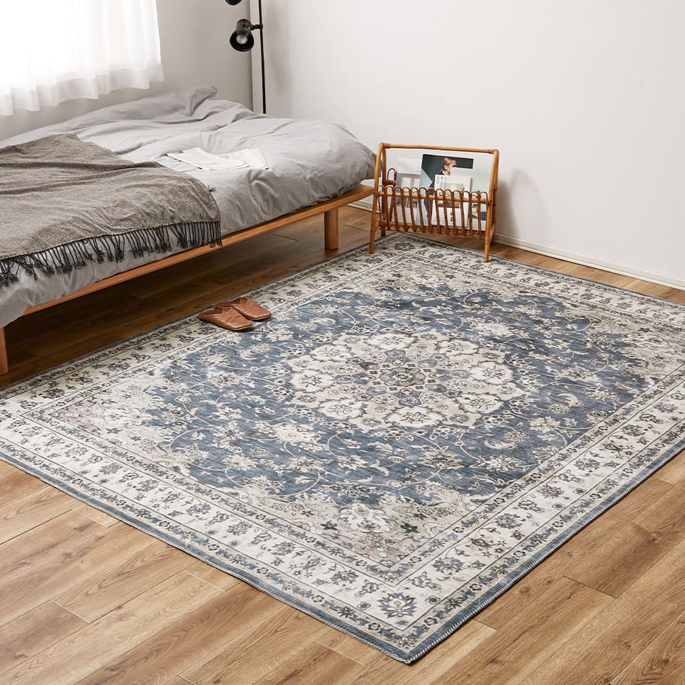 小さな模様や、ヴィンテージのようなかすれ感を細部までプリントで表現した、まるで高級ラグのような一枚。