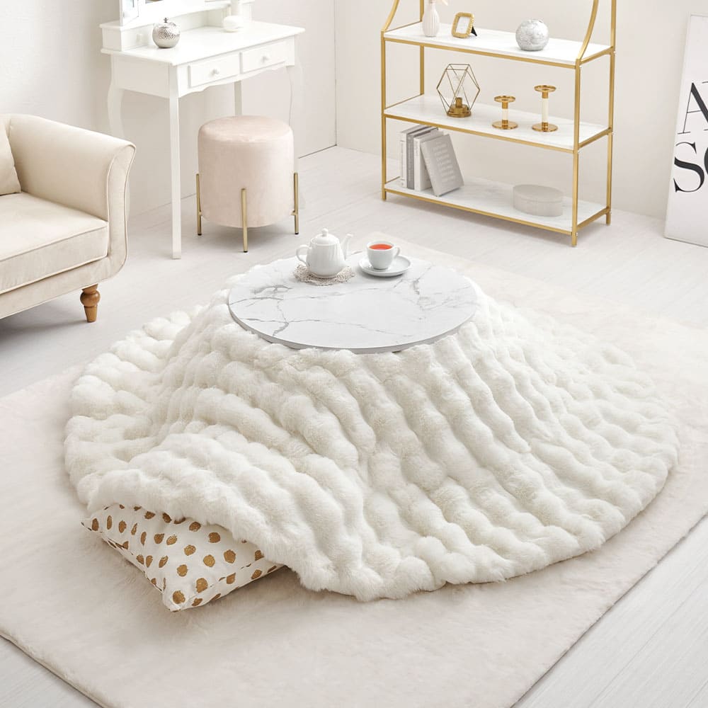 うさぎの毛並みを表現した「ラビットファー調」は、きめ細やかでうっとりするような、なめらかな肌ざわり。やさしく包み込むようなふわふわタッチに、ぽこぽことした見た目も可愛いおしゃれなこたつ布団です。かさばらずすっきりと使いやすい薄掛けタイプのこたつ布団ですが、たっぷりの中わた入りでボリュームがあり、ぎゅっと詰まった高密度な長毛パイルが空気を多く含み、あたたかさを保ち快適に。また、洗濯機で洗えるから汚れても安心、いつも清潔にお使いいただけます。