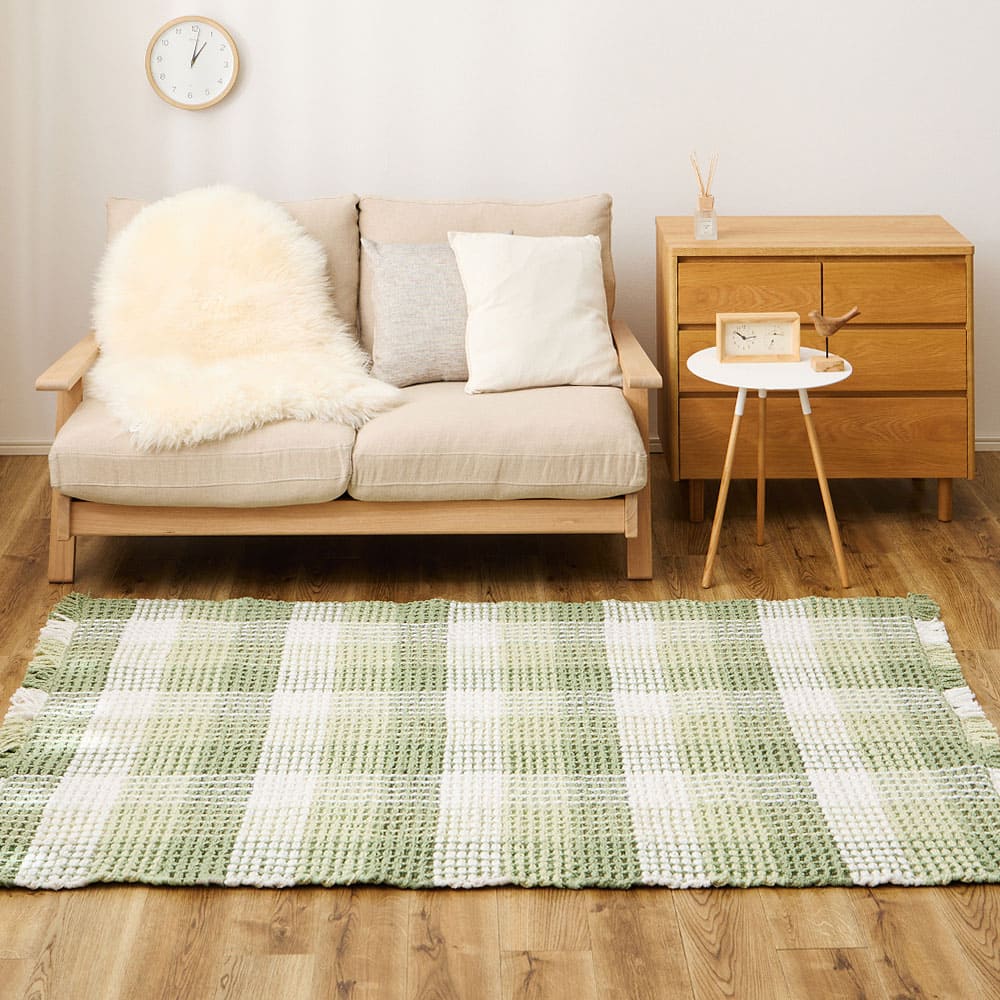 やわらかい糸を立体的に織り込んだワッフル風のぽこぽこ触感。コットンのサラッとしたタッチと、ポリエステルの乾きやすさ、ふたつの素材の特徴を活かした使いやすいラグマットです。汚れたら洗濯機で洗えるのも嬉しいポイント。さわやかなギンガムチェックのデザインで、インテリアのアクセントにぴったりなアイテムです。