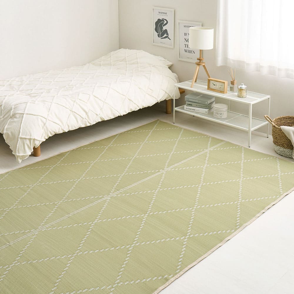 パステルカラーがかわいい、水に強い素材でできたい草風カーペット。地味な雰囲気になりがちな和室も明るくかわいいお部屋にイメージチェンジできます。傷んでしまった畳のカバーや、新しい畳の日焼けやキズの防止にも。パイプの表面に筋が入っている筋入りパイプで、肌に密着しないからベタベタしにくく、汗ばむ季節にもおすすめ。また、パイプ内の空気層の保温効果で床からの冷気を防ぐため、寒い季節でもあたたかく過ごせます。
