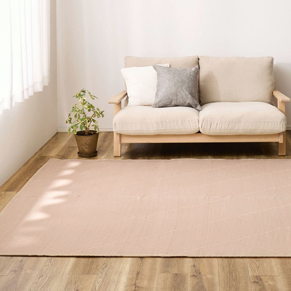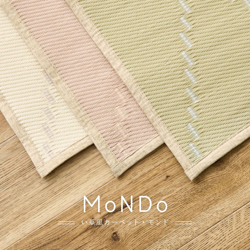 パステルカラーがかわいい、水に強い素材でできたい草風カーペット。地味な雰囲気になりがちな和室も明るくかわいいお部屋にイメージチェンジできます。傷んでしまった畳のカバーや、新しい畳の日焼けやキズの防止にも。パイプの表面に筋が入っている筋入りパイプで、肌に密着しないからベタベタしにくく、汗ばむ季節にもおすすめ。また、パイプ内の空気層の保温効果で床からの冷気を防ぐため、寒い季節でもあたたかく過ごせます。裏面は不織布貼りで、フローリングなど床への傷が心配な場所でも安心です。