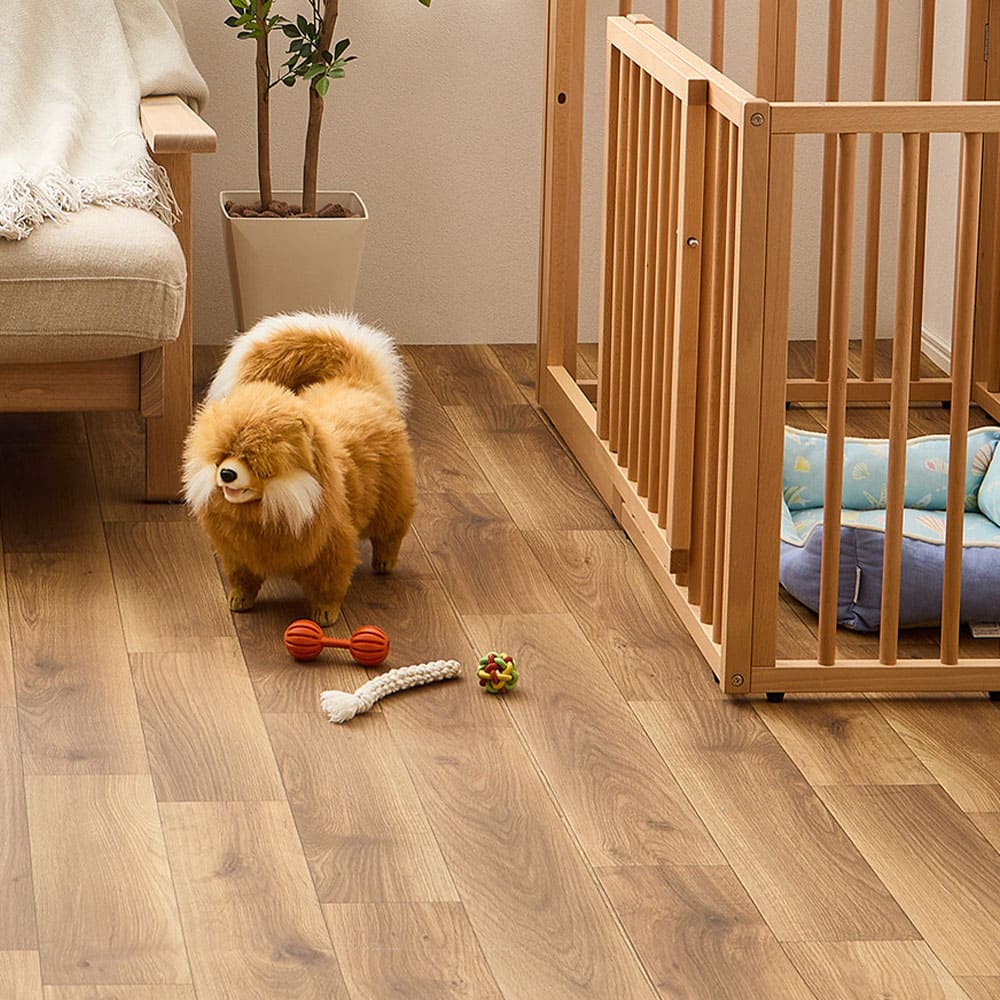 表面のコーティングによりワックスいらずでお手入れ簡単!防滑性・耐久性を備え傷がつきにくく、通常のクッションフロアより厚みがあり適度なクッション性でペットの足腰への負担を軽減します。抗菌・抗ウイルス機能付きで衛生面も安心。約90cm幅のマットサイズで使いやすく、カットもOK。また、複数枚を並べてお部屋に敷き詰めても◎
