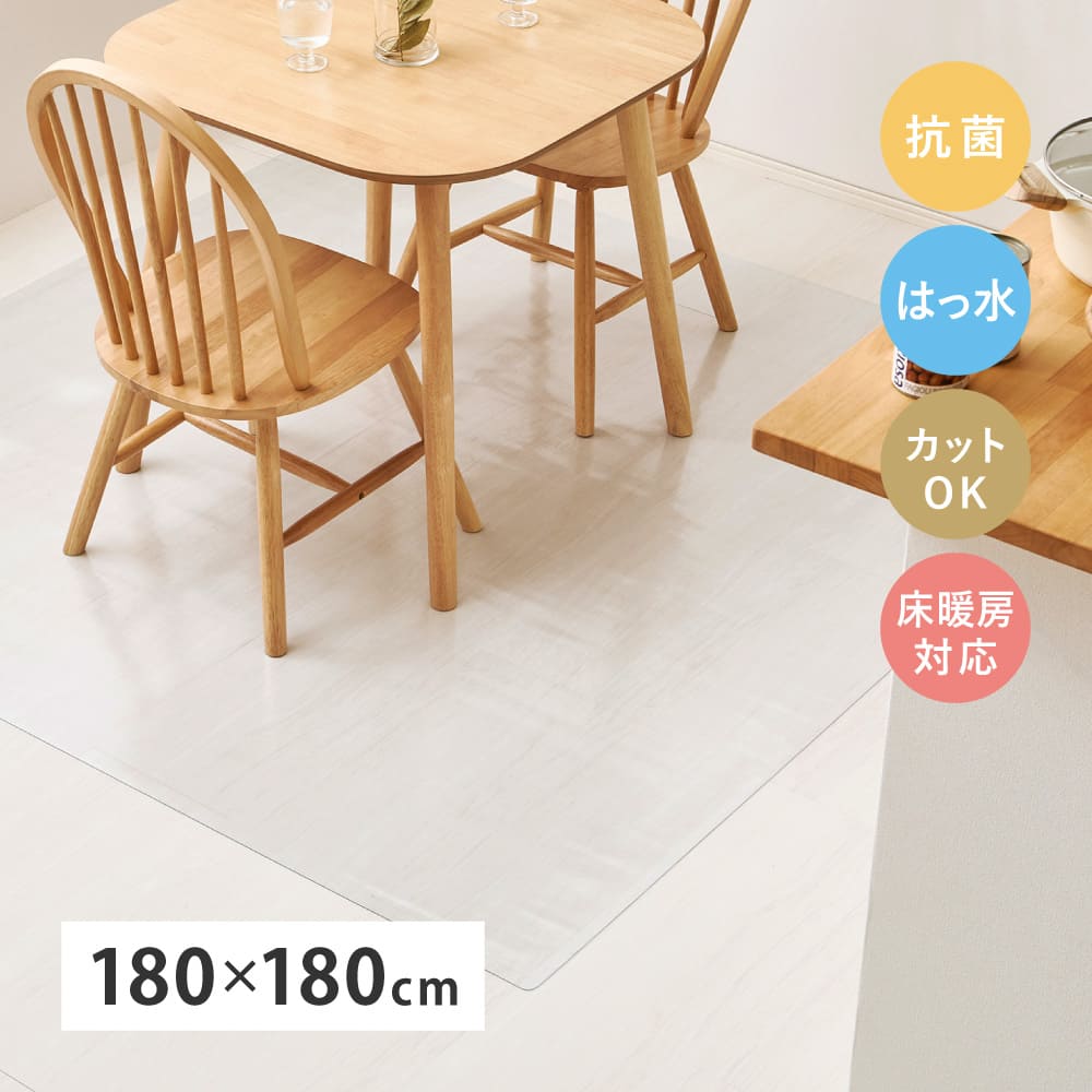 インテリアの邪魔をしない、クリア素材のダイニングラグ。床面が透けて見えるため圧迫感がなく、お部屋の雰囲気はそのままに床をしっかり守ります。スペースに合わせて自由にカットしてもお使いいただけます。耐水性に優れたPVC素材でお手入れしやすく、汚れの気になるキッチンやダイニングなどに。床暖房にも対応しており、約1.2mmと薄手のため床暖房のぬくもりを遮ることなく快適に過ごせます。