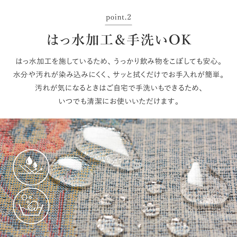 たくさんの花束モチーフが空間を上品に彩る、ゴブラン織りシェニールラグ。ビロードのような毛羽をもつシェニール糸を使用し、さらりとなめらかな肌触りで季節を問わず快適に使えます。はっ水加工により、飲み物をこぼしてもサッと拭き取りやすく、汚れが気になるときは手洗いも可能。約5mmのウレタン入り三層構造で、程よい厚みとクッション性があり、くつろぎ時間や家族団らんに心地よさをプラスします。裏面は滑り止め付きでズレにくく、ホットカーペット・床暖房にも対応。リビングやダイニングなど、日常使いしやすい一枚です。