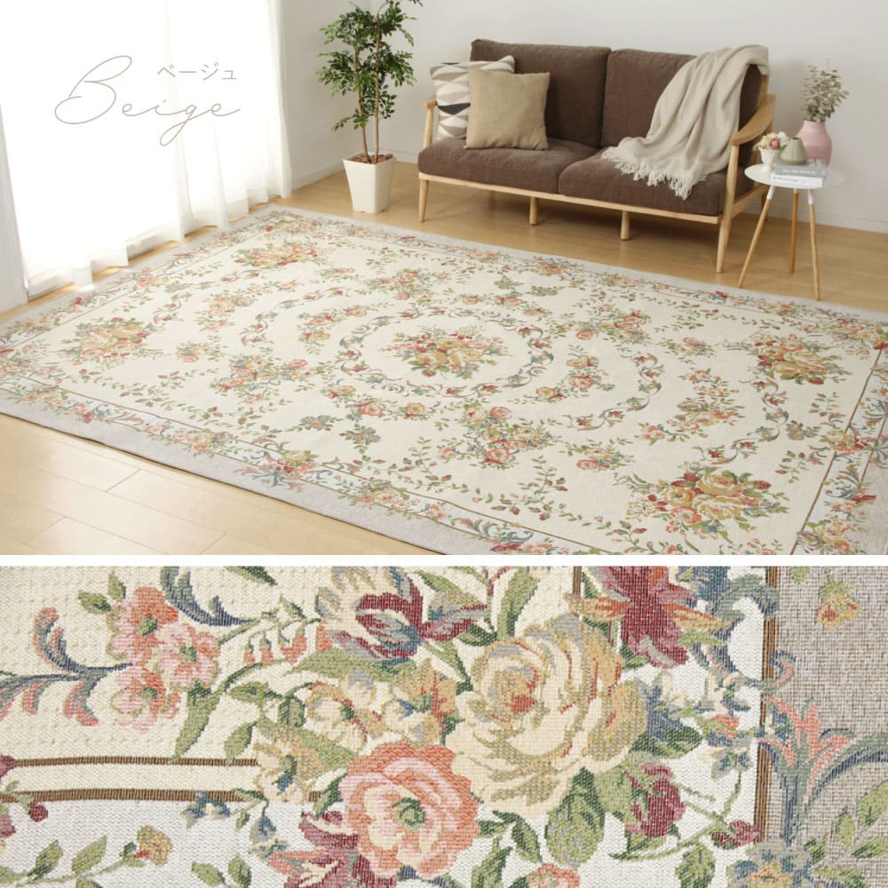 たくさんの花束モチーフが空間を上品に彩る、ゴブラン織りシェニールラグ。ビロードのような毛羽をもつシェニール糸を使用し、さらりとなめらかな肌触りで季節を問わず快適に使えます。はっ水加工により、飲み物をこぼしてもサッと拭き取りやすく、汚れが気になるときは手洗いも可能。約5mmのウレタン入り三層構造で、程よい厚みとクッション性があり、くつろぎ時間や家族団らんに心地よさをプラスします。裏面は滑り止め付きでズレにくく、ホットカーペット・床暖房にも対応。リビングやダイニングなど、日常使いしやすい一枚です。