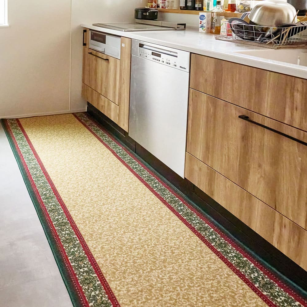 廊下の冷え防止や防音対策にもなる廊下敷きカーペット。へたりにくく長く使える丈夫なナイロン素材で、汚れが気になってきたら手洗いもOK。裏には滑り止め加工が施されているため、お子様やペットと暮らすご家庭でも安心です。廊下以外にも、キッチンやベットサイドのマットとしてもお使いいただけます。