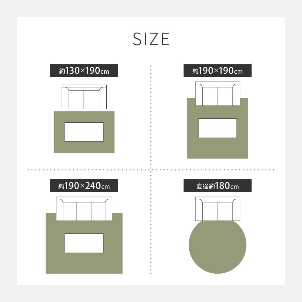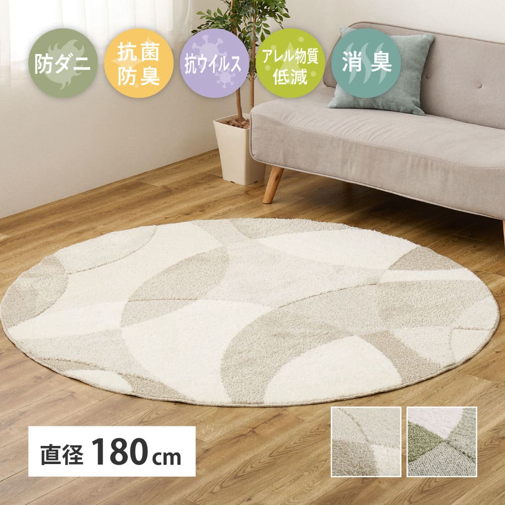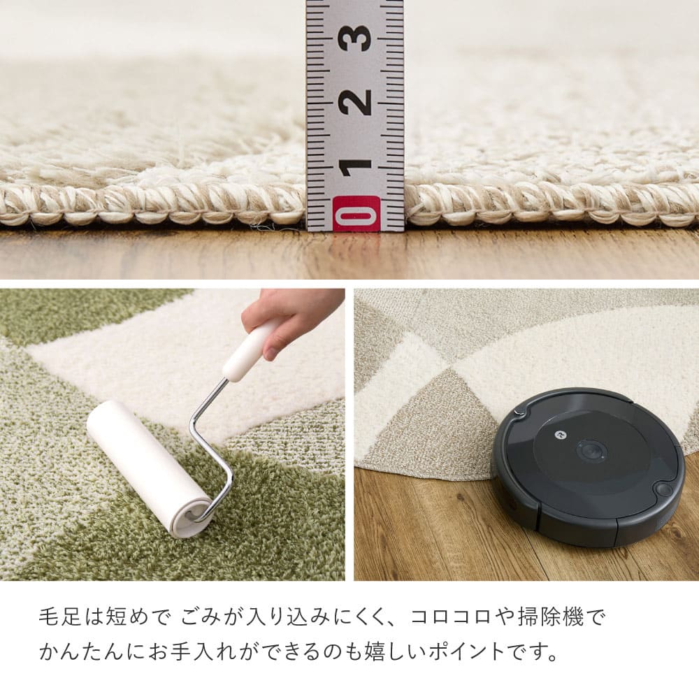 防ダニ・抗菌・抗ウイルス・消臭・花粉対策など、優れた機能を兼ね備えた安心の日本製多機能ラグ。落ち着いた色合いでインテリアにも合わせやすい、おしゃれなモダンデザイン。ふわふわなカットパイルと、さらっとした肌触りのループパイル、異なるパイルを組み合わせることでデザインに立体感が出せ、部分ごとに違うタッチ感が楽しめます。毛足が短くお手入れしやすのもうれしいポイント。裏面は不織布貼りで床を傷つけにくく、ホットカーペット・床暖房対応で、オールシーズンお使いいただけます。