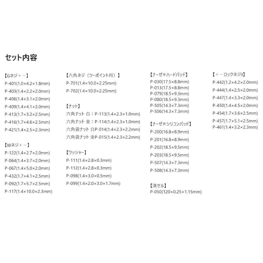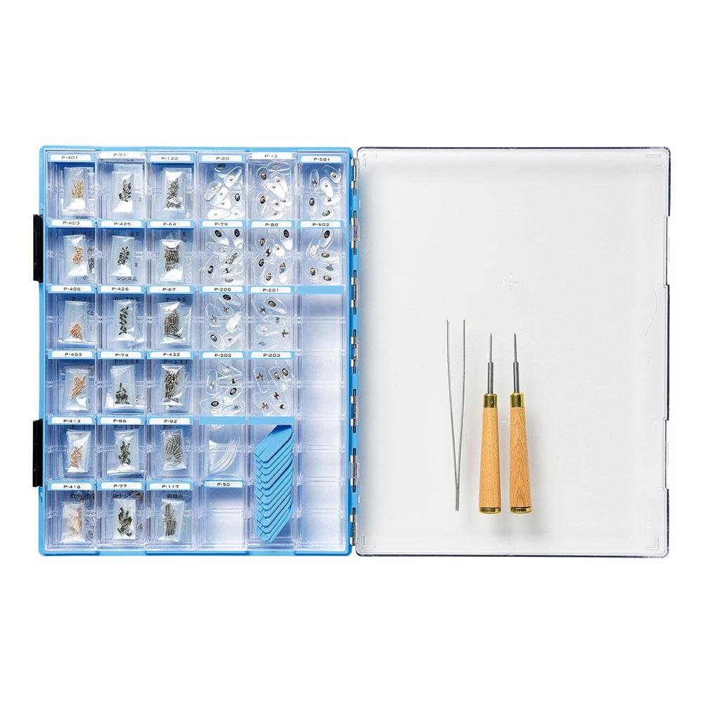 コンパクトなケースにまとまったケアセット ネジ・パッドなど、使用頻度の高い部品のみを47点選びました。多数の部品と木製ドライバー、ピンセットをコンパクトなケースにまとめています。